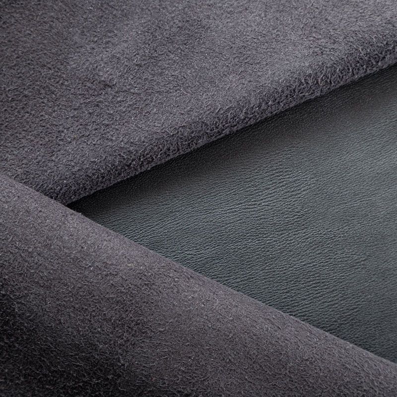 Искусственный материал, имитирующий натуральную кожу черного цвета. Поверхность матовая, гладкая. Изнаночная сторона с имитацией черной замши. Приятная на ощупь, тянется, не просвечивает, пластичная. Подойдет для пошива куртки, костюма, платья, юбки, брюк, шорт, комбинезона, сумки, рюкзака.