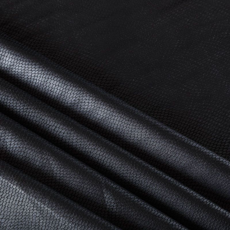 Искусственный материал, имитирующий рисунок змеиной кожи черного цвета на лицевой стороне и черной замши на изнаночной. Приятная и мягкая на ощупь, тянется за счет эластана в составе, не просвечивает, пластичная, хорошо драпируется. Подойдет для пошива куртки, костюма, платья, юбки, брюк, шорт, комбинезона, сумки, рюкзака.