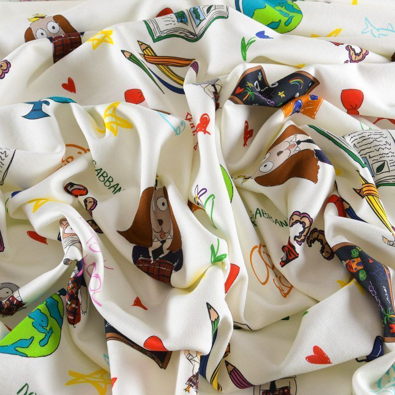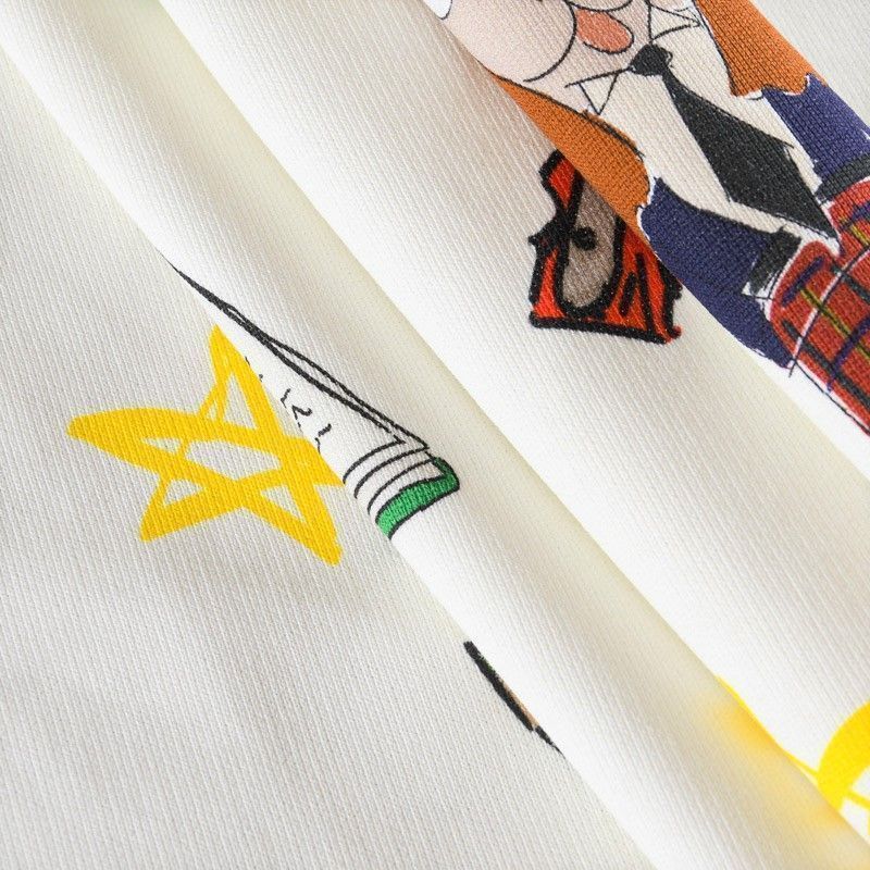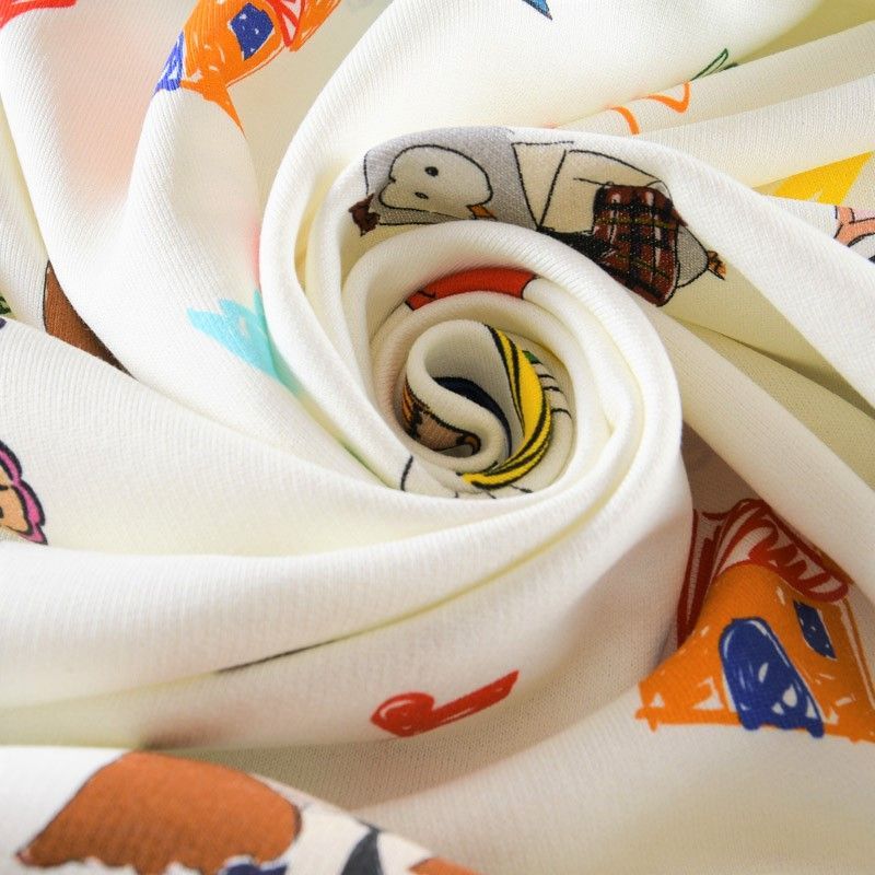Итальянский футер с ярким игривым принтом на белом фоне от известного бренда. Материал гладкий с лицевой стороны, с изнаночной стороны имеет нежную мелкую петельчатую текстуру. Ткань мягкая и комфортная, достаточно эластичная, пластичная. Хорошо садится по фигуре. Практически не мнется. После растяжения быстро возвращается к прежней форме. Подойдет для пошива толстовки, спортивного костюма, джоггеров, шорт, свитшота, кроп-топа, платья в спортивном стиле.