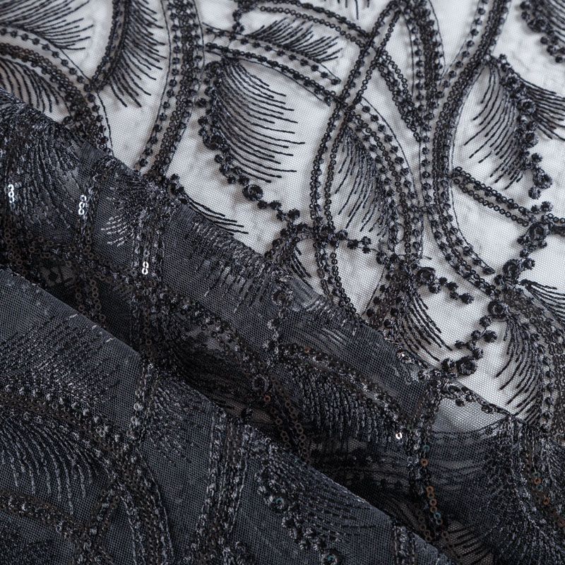 Кружевное полотно на сетчатой основе черного цвета с абстрактным узором, расположенным по ширине ткани. Тонкое, легкое, очень мягкое и пластичное, хорошо драпируется, приятное тактильно. Вышивка дополнена глянцевыми пайетками в тон. С обеих сторон ткань украшена симметричными фестонами, что придает полотну законченный и нарядный вид. Великолепно будет смотреться в нарядном вечернем, свадебном платье, платье на выпускной бал, в юбках, блузках, топах. На изделие набирается объемом.
