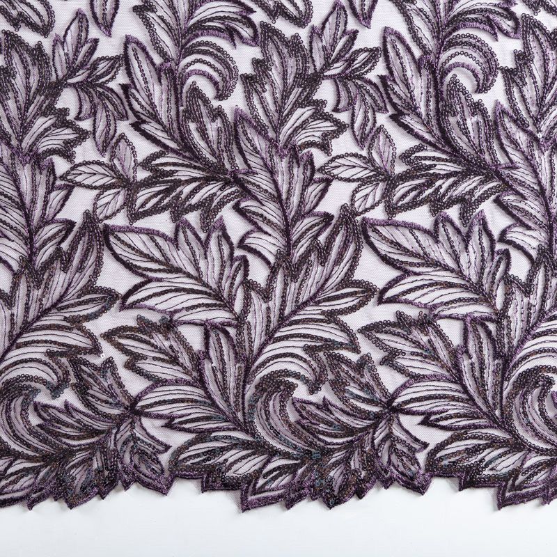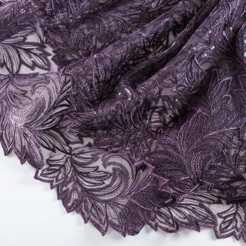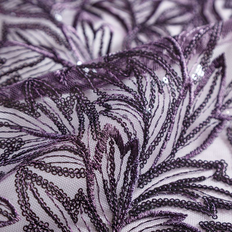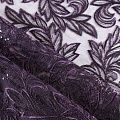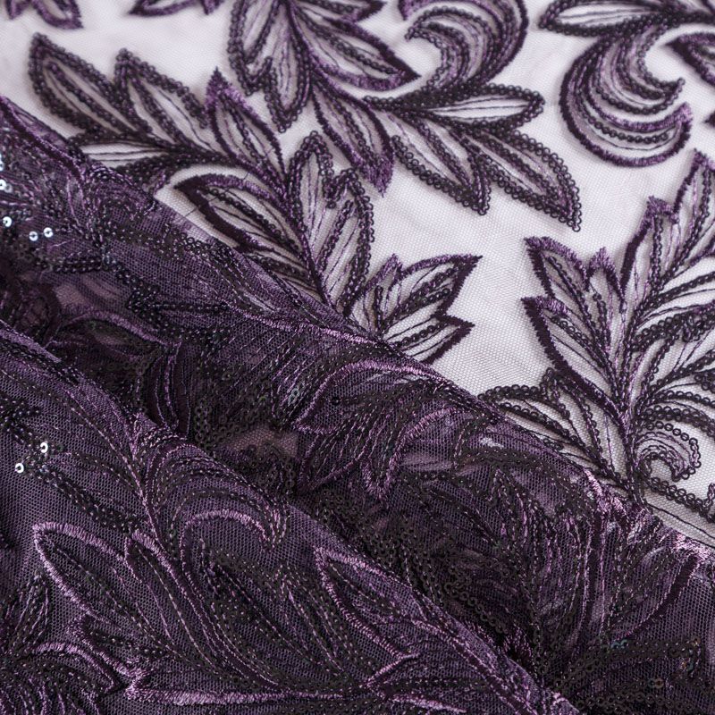Кружевное полотно на сетчатой основе насыщенного фиолетового оттенка с растительным узором, расположенным по ширине ткани. Тонкое, легкое, очень мягкое и пластичное, хорошо драпируется, приятное тактильно. Вышивка дополнена глянцевыми пайетками в тон. С обеих сторон ткань украшена симметричными фестонами, что придает полотну законченный и нарядный вид. Великолепно будет смотреться в нарядном вечернем, свадебном платье, платье на выпускной бал, в юбках, блузках, топах. На изделие набирается объемом.