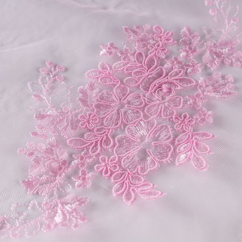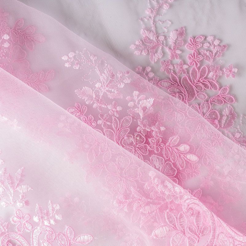 Вышивка на сетке розового оттенка с флористическим узором. Полотно мягкое, легкое и пластичное, хорошо тянется. Сетка не жесткая, приятная к телу. Узор вышит мягкой пряжей, образуя красивую фактуру, имитирующую ручную вышивку, и оформлен кордовой нитью. С обеих сторон ткань украшена симметричными фестонами, что придает полотну законченный и нарядный вид. Великолепно будет смотреться в нарядном вечернем, свадебном платье, платье на выпускной бал, в юбках, блузках, топах. Набирается для изделя объемом.