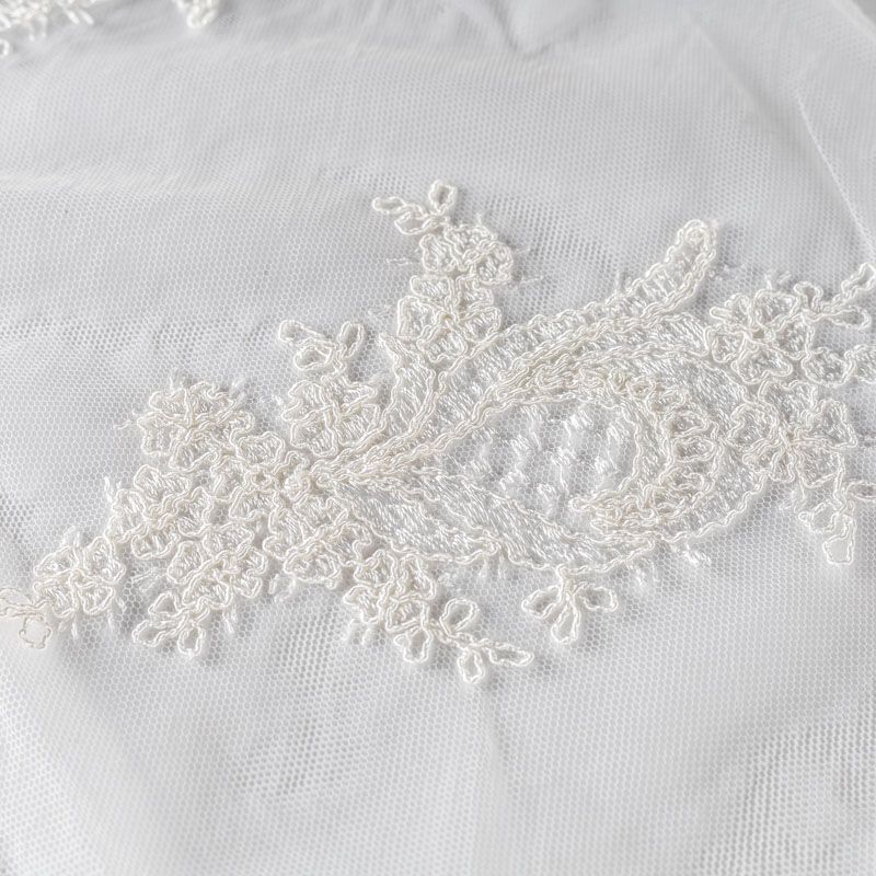 Вышивка на сетке молочного оттенка с крупным фантазийным узором в виде пера жар-птицы. Полотно мягкое, легкое и пластичное, хорошо тянется. Сетка не жесткая, приятная к телу. Узор вышит мягкой пряжей, образуя красивую фактуру, имитирующую ручную вышивку, и оформлен кордовой нитью. С обеих сторон ткань украшена симметричными фестонами, что придает полотну законченный и нарядный вид. Великолепно будет смотреться в нарядном вечернем, свадебном платье, платье на выпускной бал, в блузках, топах. Набирается для изделя объемом.