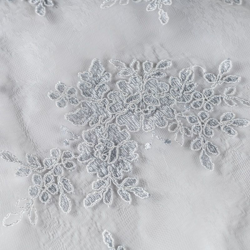 Кружевное полотно на сетчатой жаккардовой основе жемчужного оттенка с флористическим узором. Тонкое, легкое, очень мягкое и пластичное, хорошо драпируется, приятное тактильно. Вышивка оформлена кордовой нитью. С обеих сторон ткань украшена симметричными фестонами, что придает полотну законченный и нарядный вид. Великолепно будет смотреться в нарядном вечернем, свадебном платье, платье на выпускной бал, в юбках, блузках, топах. Также можно применять отдельные элементы для декора, которые вырезаются из полотна.