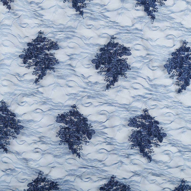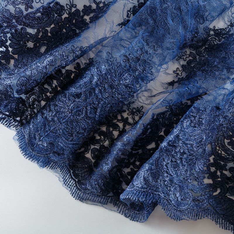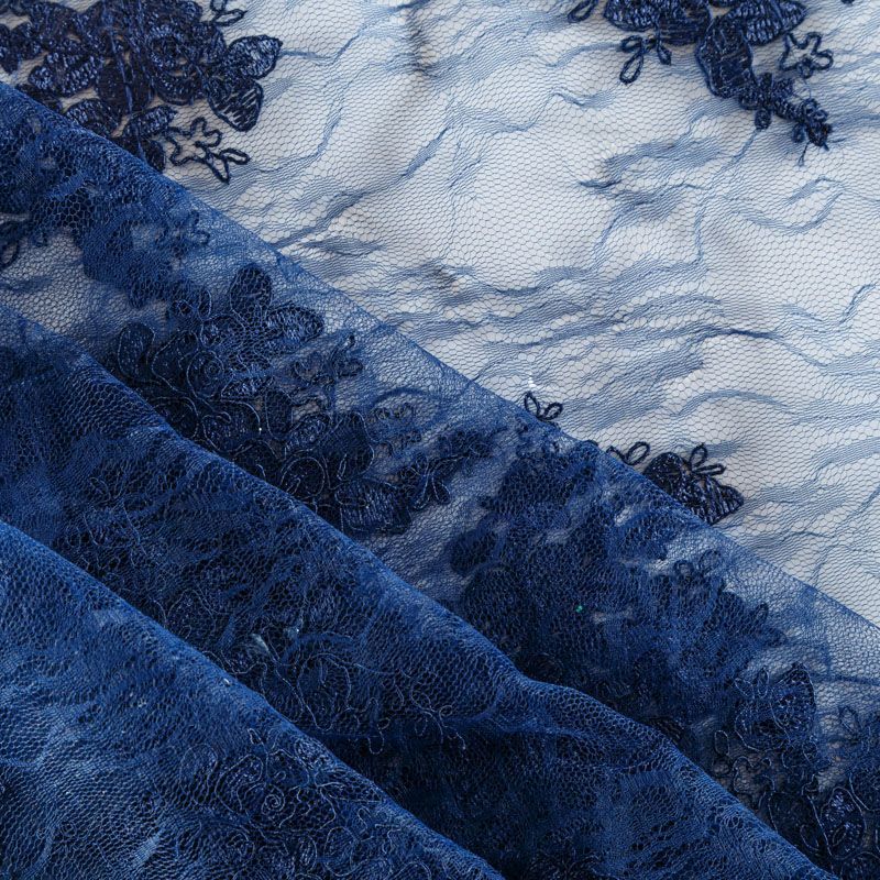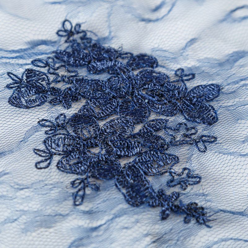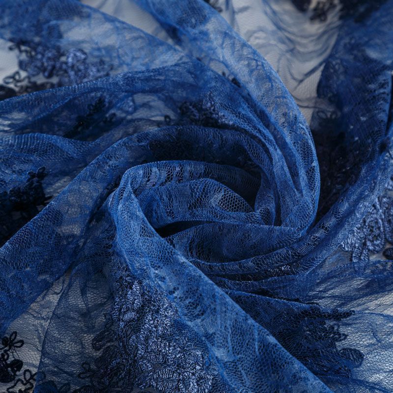 Кружевное полотно на сетчатой жаккардовой основе благородного темно-синего оттенка с флористическим узором. Тонкое, легкое, очень мягкое и пластичное, хорошо драпируется, приятное тактильно. Вышивка оформлена кордовой нитью. С обеих сторон ткань украшена симметричными фестонами, что придает полотну законченный и нарядный вид. Великолепно будет смотреться в нарядном вечернем, свадебном платье, платье на выпускной бал, в юбках, блузках, топах. Также можно применять отдельные элементы для декора, которые вырезаются из полотна.