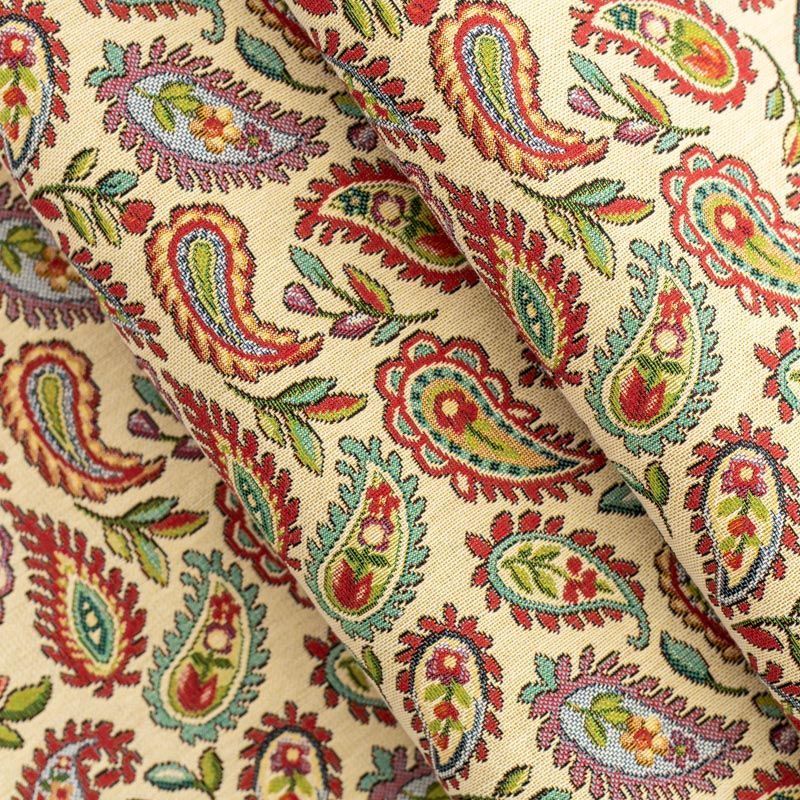 Гобелен представляет собой ткань, выполненную перекрестным плетением нитей с одномоментным созданием сюжетной или орнаментальной композиции. Это плотный материал высокую прочность и износостойкость. Гобелен используют для пошива плотных светонепроницаемых штор, декоративного домашнего текстиля и аксессуаров, в мебельном производстве для обивки мебели. Так же применяется в рукоделии: модные кошельки, сумочки, пояса и другие аксессуары и при изготовлении дизайнерской одежды. На спокойном песочно-бежевом фоне растительный цветной узор в стиле пейсли.
