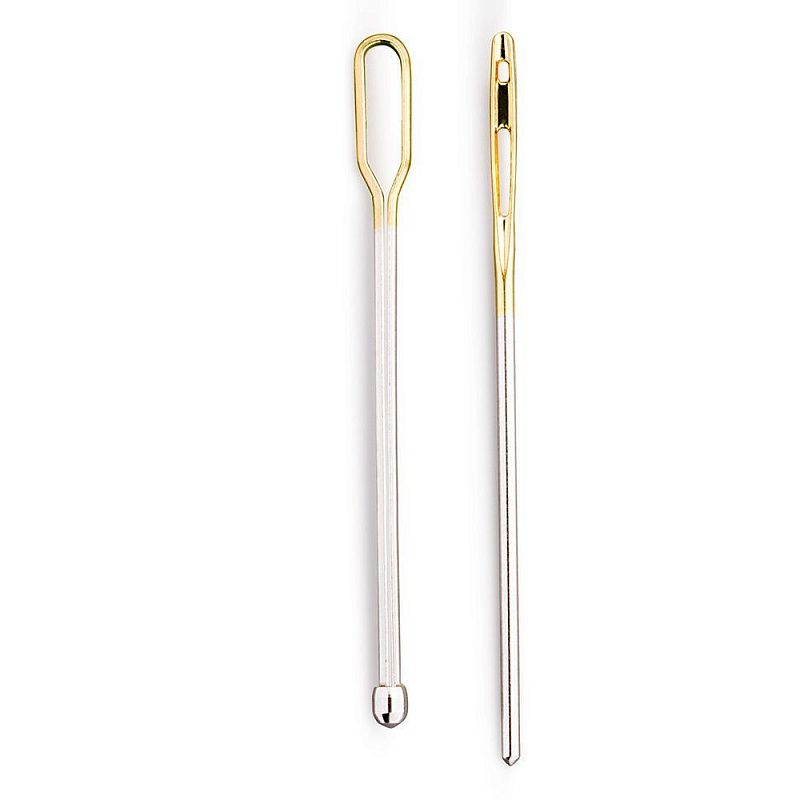 Иглы с округленным острием и большим ушком для протягивания резинки и тесьмы, эластичных лент и шнуров через пояс брюк, капюшон и т.п. Версия из латуни является разделенной в стержневой части, открытой к ушку иглой, причем острие иглы скруглено в форме шара. Если заправить в это ушко ленту и затем протянуть ее между половинами стержня иглы вниз, то она будет зажата, и после этого ее, когда она прочно зафиксирована, можно протянуть через кулиску. Другая игла для протягивания из нержавеющей стали также является тупой иглой. Но у нее широкий, и за счет этого более тонкий стержень с одним длинным и одним круглым ушком. Длинное ушко при этом предназначено для лент и толстых ниток, а круглое подходит для более тонких ниток и круглых резинок. Скругленное острие игл не может проткнуть ткань и поэтому легко скользит по любой тканевой кулиске. Сбалансированный коэффициент жесткости пружины и поверхность с гладким покрытием превращают эти иглы в профессиональные инструменты. Длина игл: 6.5 см и 7 см.