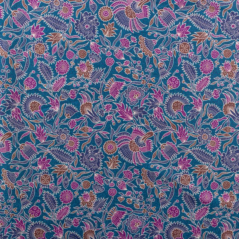 Плательно-рубашечный натуральный хлопок со стилизованным растительным принтом в синих, розовых и коричневых тонах на сложном сине-зеленом фоне. Ткань имеет плотное переплетение, матовую гладкую поверхность, хорошо держит форму, не прозрачная. Подойдет для пошива рубашек, платья-рубашки, юбки, сарафана, туники, домашней одежды.
