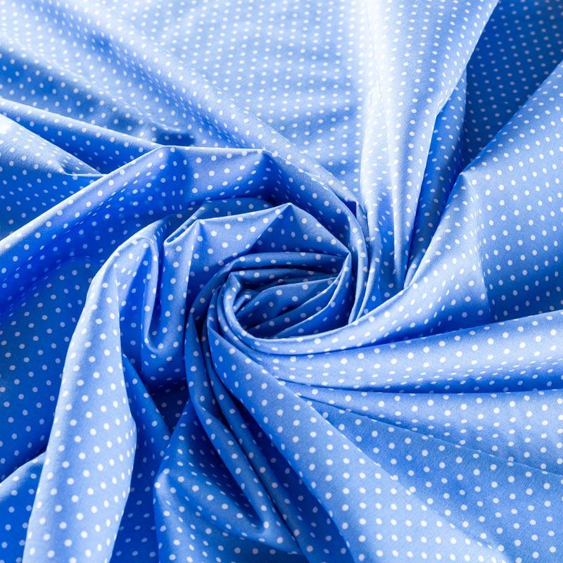 Плательно-блузочная ткань из натурального хлопка в мелкий горошек. Ткань легкая, тонкая, хорошо "дышит", мягкая, не прозрачная, немного тянется за счет эластана в составе. Подойдет для пошива летнего платья, летящей юбки, блузы, сарафана, комбинезона или рубашки.