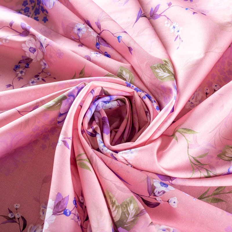 Плательно-рубашечный хлопок розовато-лилового оттенка с элегантным цветочным принтом. Ткань очень лёгкая, воздушная, тонкая, похожа на батист, немного прозрачная, поверхность матовая, гладкая, приятная к телу, хорошо драпируется. Прекрасно подойдет блузы, платья-рубашки, летнего сарафана, туники.
