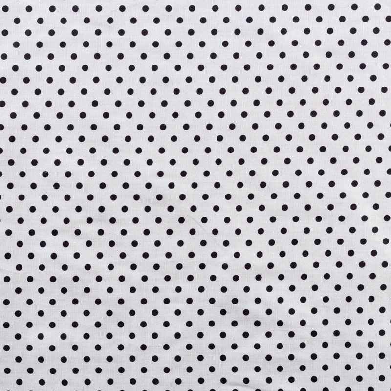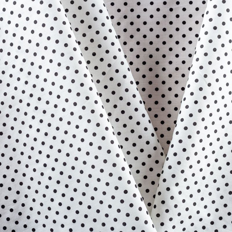 Плательно-блузочная ткань из натурального хлопка в мелкий черный горошек. Ткань легкая, тонкая, хорошо "дышит", мягкая, не прозрачная. Подойдет для пошива летнего платья, летящей юбки, блузы, сарафана, комбинезона или рубашки.