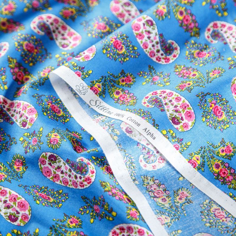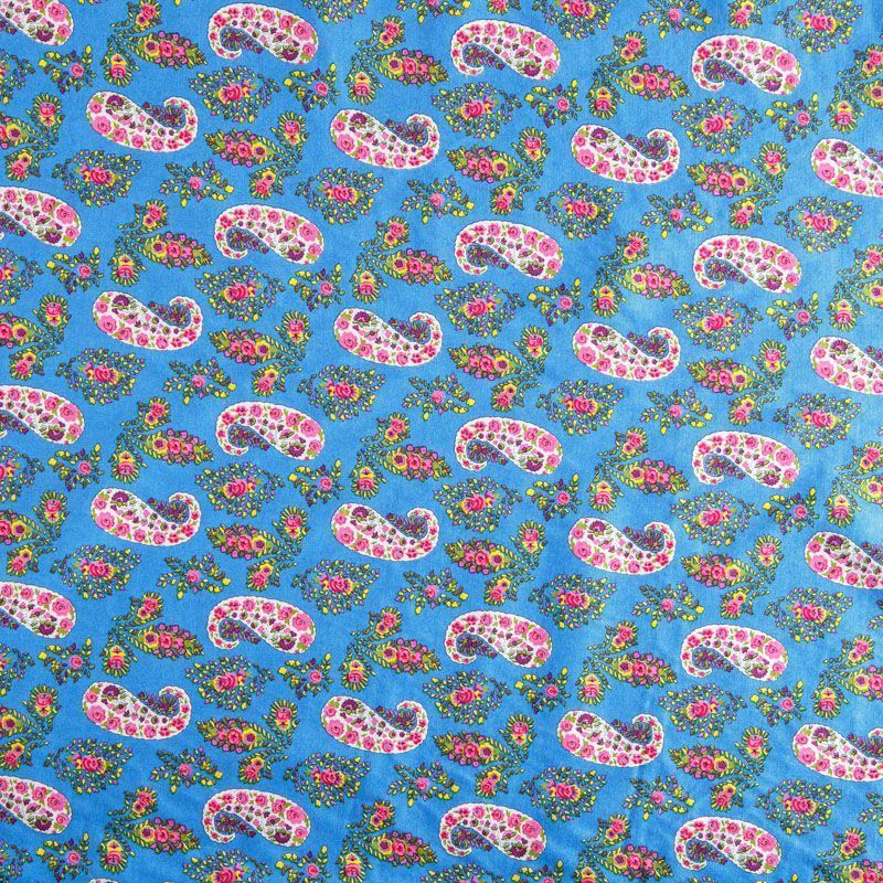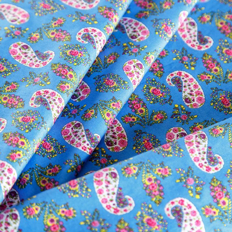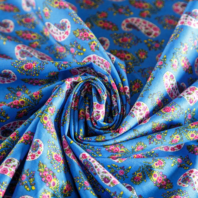 Плательно-рубашечная ткань из натурального хлопка с узором пейсли. Ткань легкая, тонкая, хорошо "дышит", слегка держит форму, не сухая, не прозрачная. Подойдет для пошива летнего платья, летящей юбки, блузы, сарафана, комбинезона или рубашки, а также для домашней одежды.