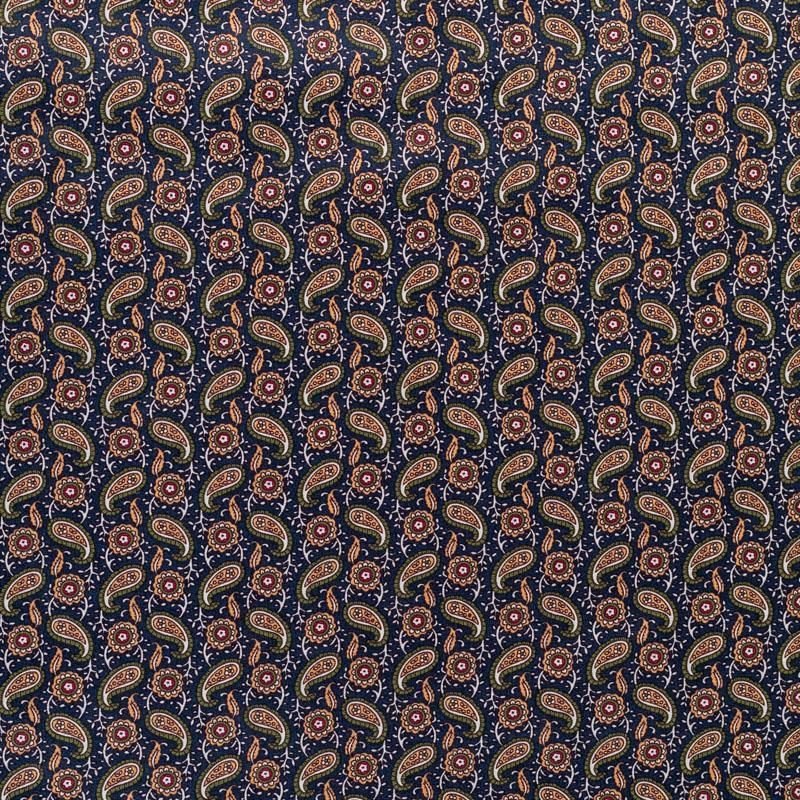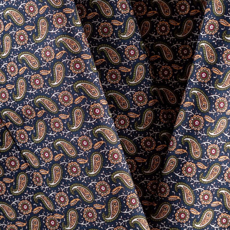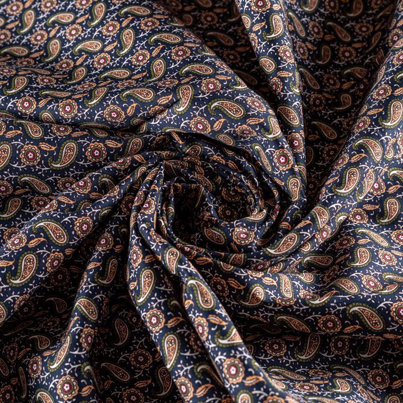 Рубашечно-плательный натуральный хлопок с узором пейсли в зеленых и карамельных тонах на насыщенном синем фоне. Ткань имеет плотное переплетение, матовую гладкую поверхность, хорошо держит форму, не прозрачная. Подойдет для пошива мужских рубашек, платья-рубашки, юбки, сарафана, туники.