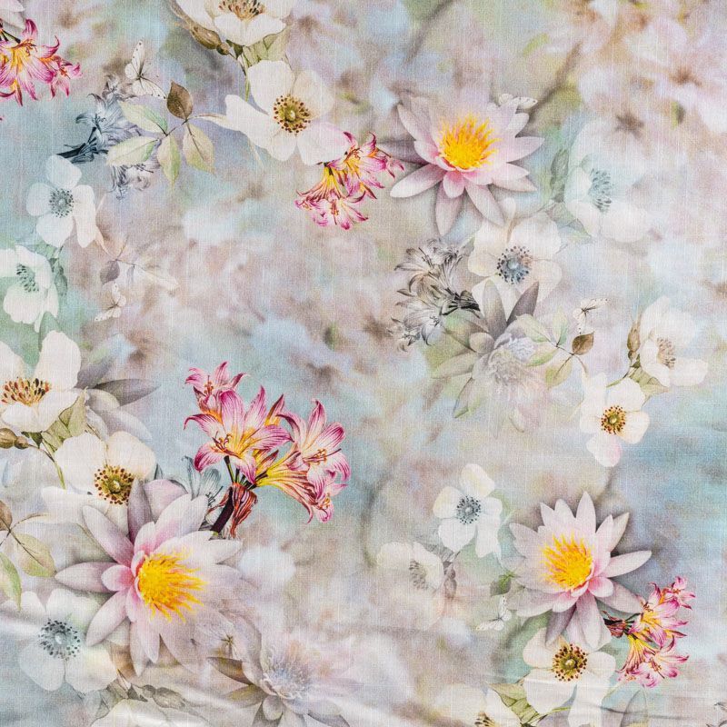 Плательно-блузочная ткань из натурального хлопка с крупным расттительным принтом в пастельных тонах на серо-зеленом фоне. Ткань легкая, тонкая, хорошо "дышит", мягкая, слегка прозрачная, по плотности напоминает батист. Подойдет для пошива летнего платья, летящей юбки, блузы, сарафана или рубашки.