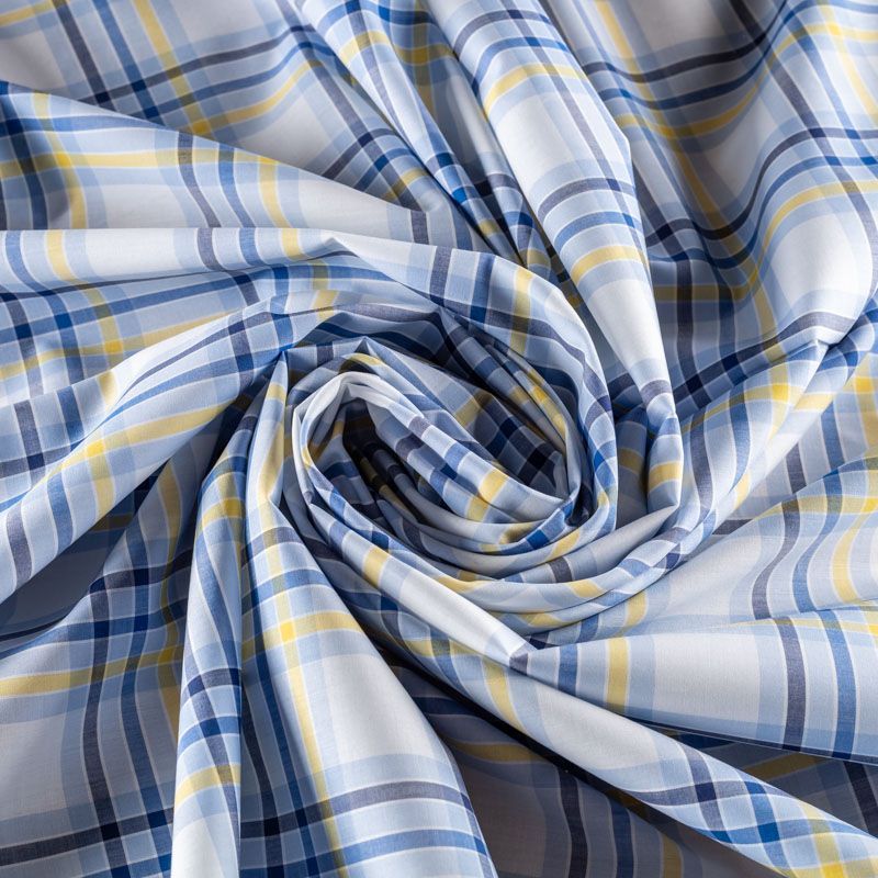 Ткань мягкая, тонкая, лёгкая, непрозрачная, поверхность матовая, приятная к телу, хорошо драпируется. По назначению - рубашечная, для юбки, платья, сарафана, туники. Сочетание полос серого, голубого, синего и желтого цветов образует красивую клетку на белом фоне.