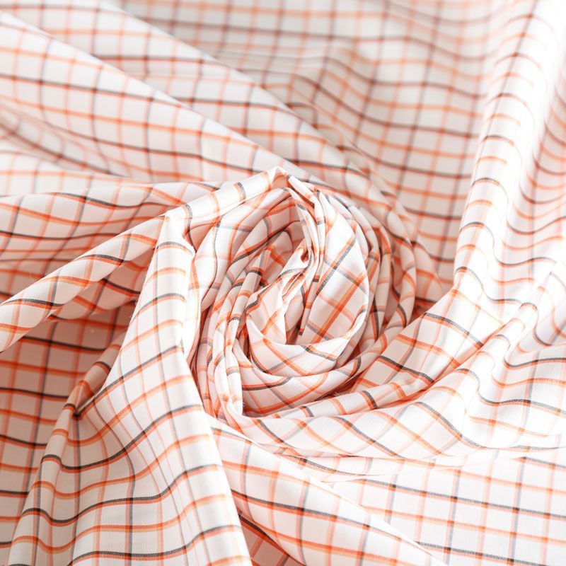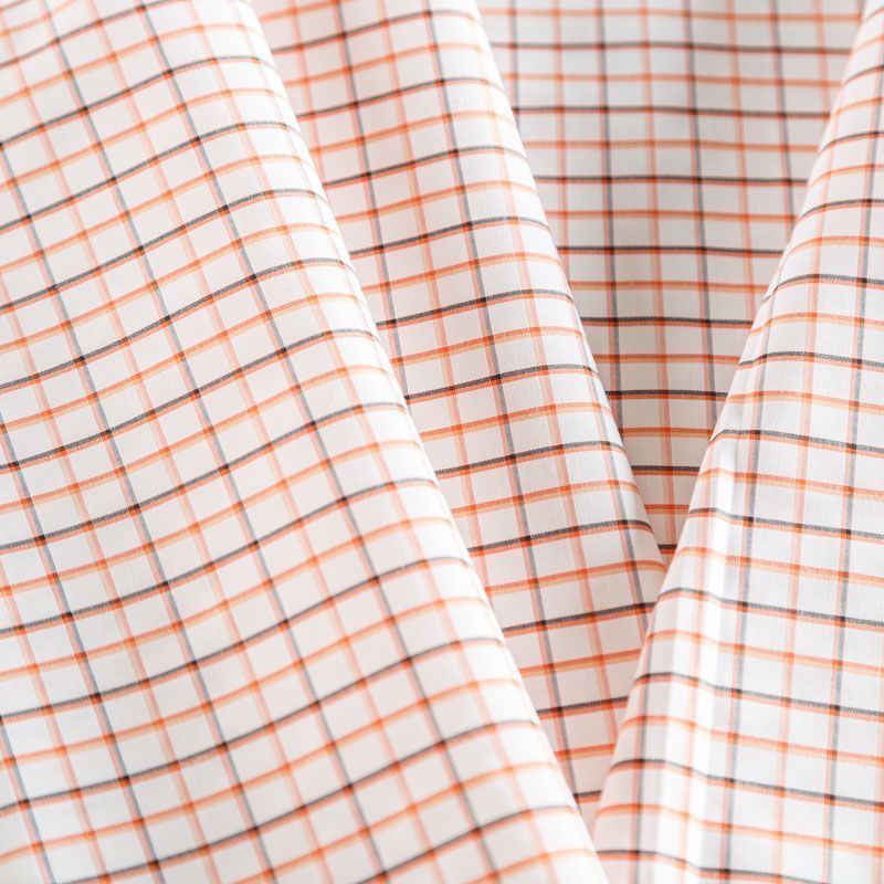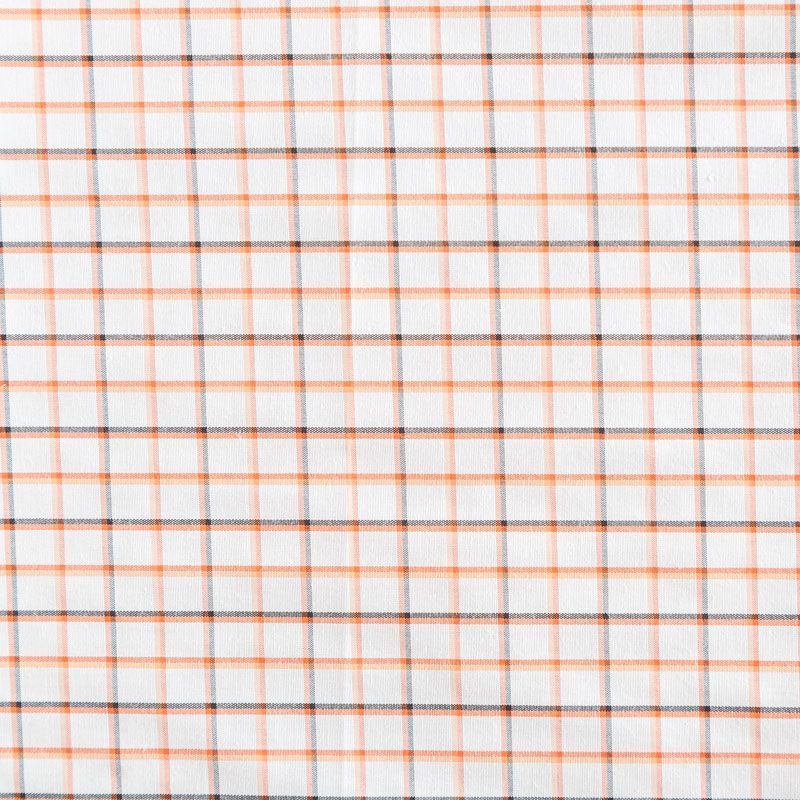 Плательно-рубашечный хлопок в белого цвета в оранжевую клеточку. Ткань мягкая, лёгкая, непрозрачная, пластичная и приятная к телу, хорошо драпируется, имеет гладкую матовую поверхность и сатиновое плетение. Прекрасно подойдет как для пошива платья-рубашки, сарафана, платьев различных фасонов, туники, топа, летнего костюма, комбинезона, мужкой и детской одежды.