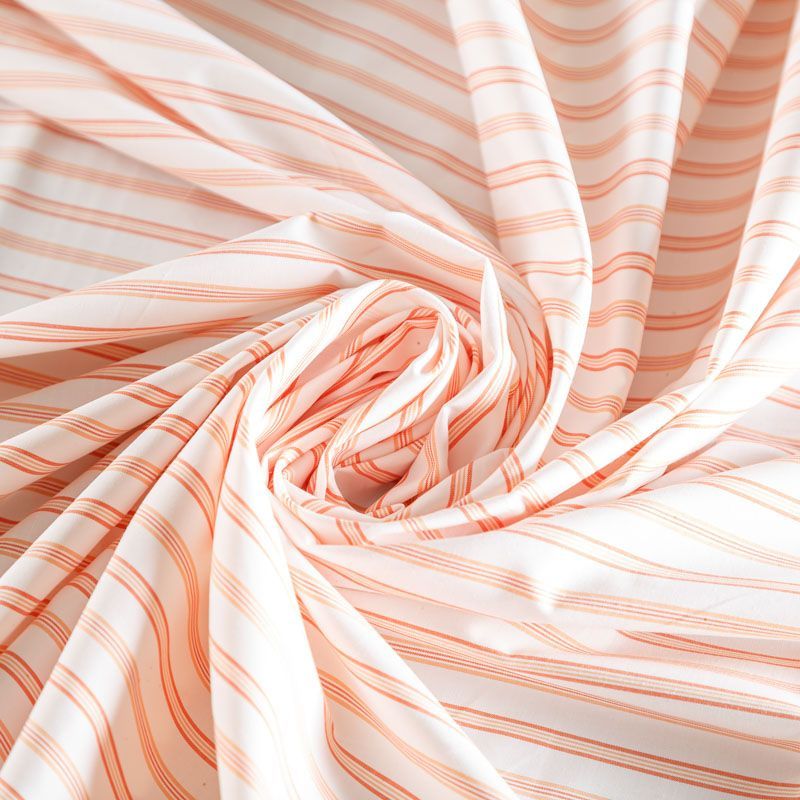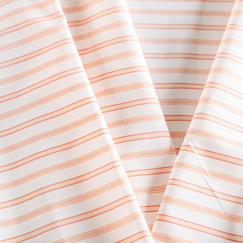 Плательно-рубашечный хлопок в белого цвета освежает разноразмерная красно-оранжева полоска. Ткань мягкая, лёгкая, непрозрачная, пластичная и приятная к телу, хорошо драпируется, имеет гладкую матовую поверхность и сатиновое плетение. Прекрасно подойдет как для пошива платья-рубашки, сарафана, платьев различных фасонов, туники, топа, летнего костюма, комбинезона, мужкой и детской одежды.