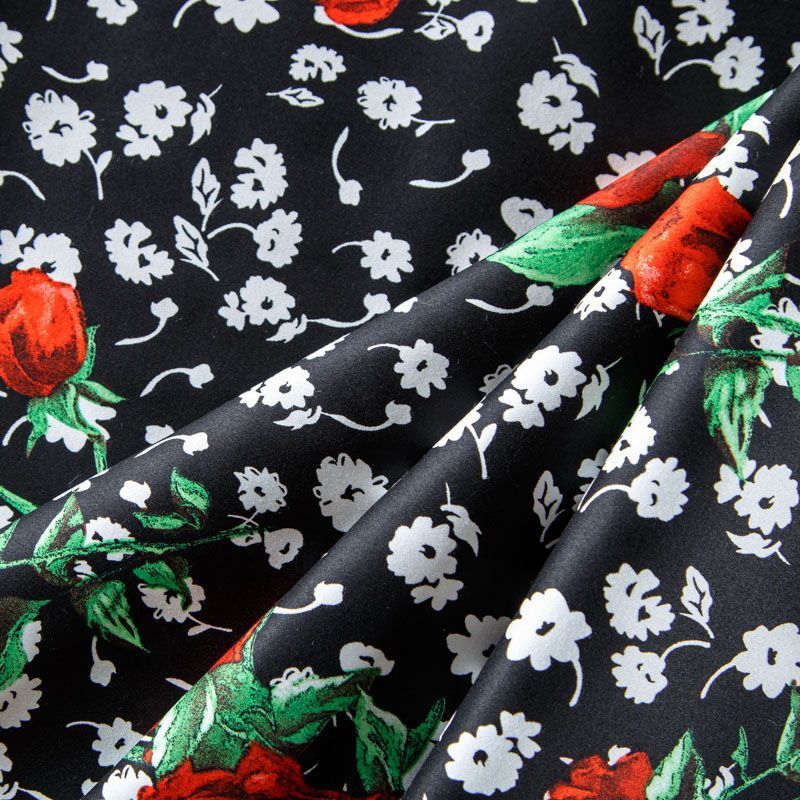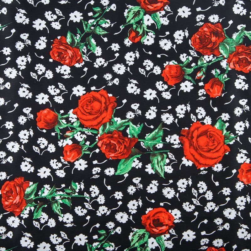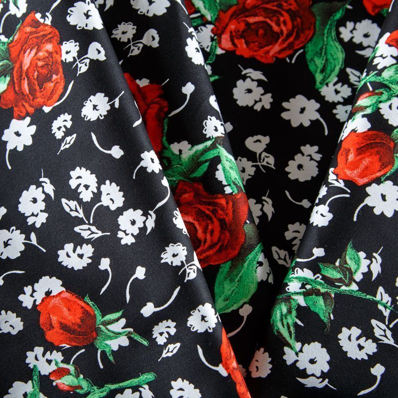 Коттон черного цвета с ярким цветочным принтом. Поверхность гладкая, матовая, ткань средней плотности,  не толстая, хорошо держит форму, тянется за счет эластана в составе. Подойдет для пошива костюма, жакета, юбки, платья, брюк или шорт.
