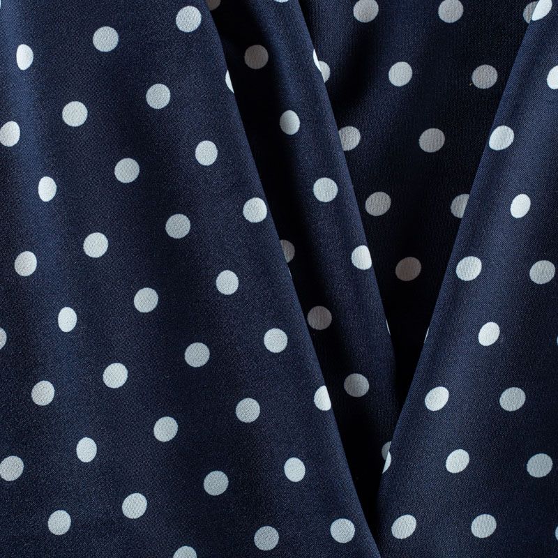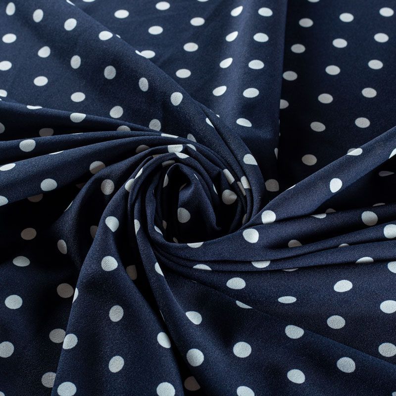 Плательный креп с принтом в горох. Ткань средней плотности, не толстая, пластичная, поверхность полотна матовая, с характерной мелкозернистой фактурой, прочная, хорошо драпирующаяся. Превосходно подойдет для пошива стильного костюма, юбки, платья, комбинезона, топа, брюк.
