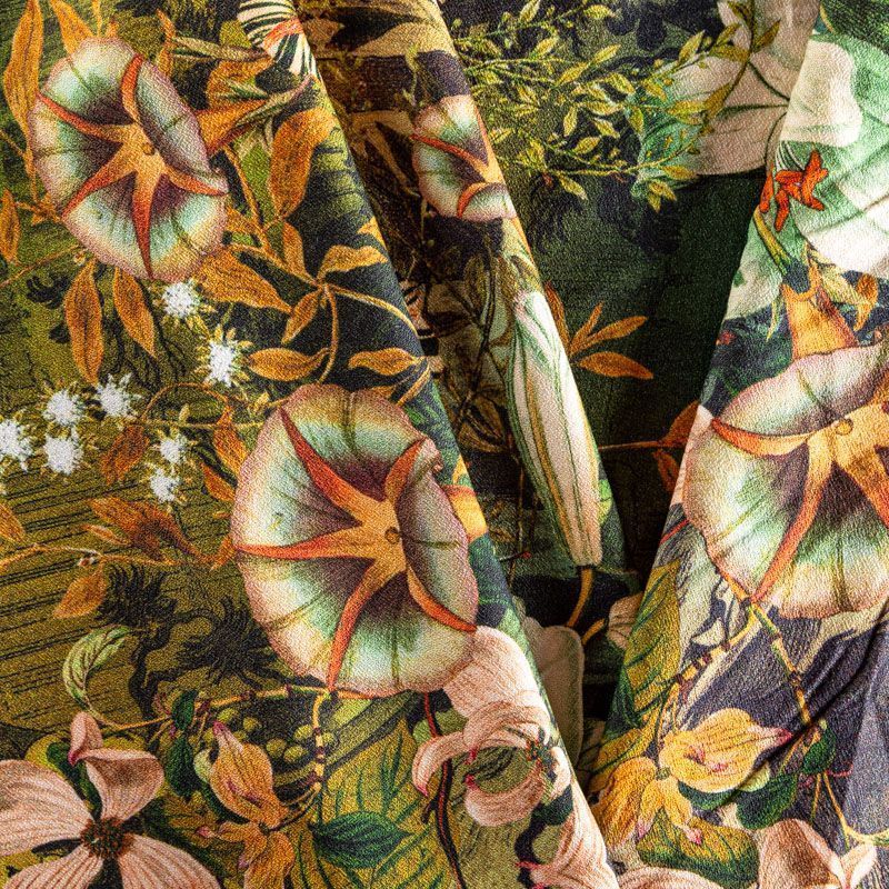Итальянский креп плательной плотности зеленого оттенка хаки с фантазийным цветочным принтом. Поверхность матовая и фактурная, ткань малосминаемая, тянется за счет эластана в составе, красиво драпируется, струится и дает объемную складку, не просвечивает.Идеально подойдет для шикарного платья, блузы, юбки, комбинезона, брюк свободного кроя.