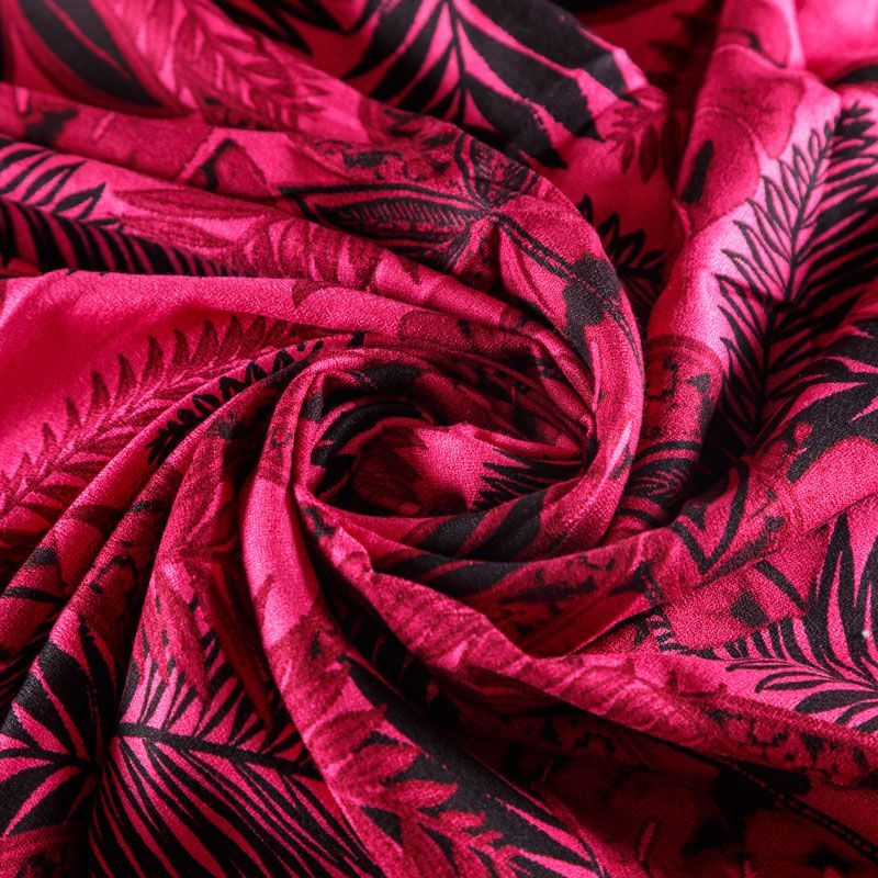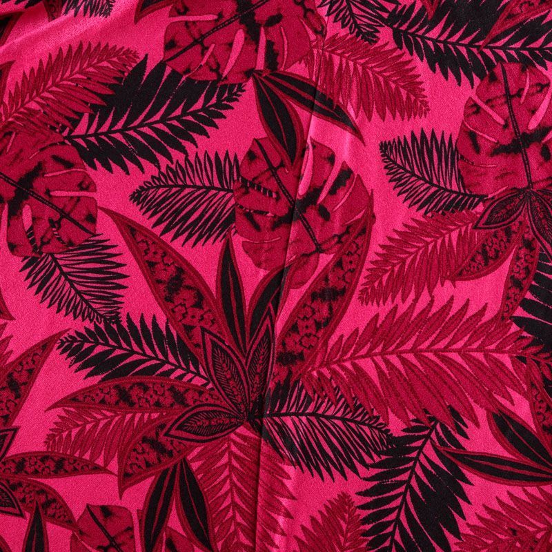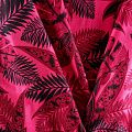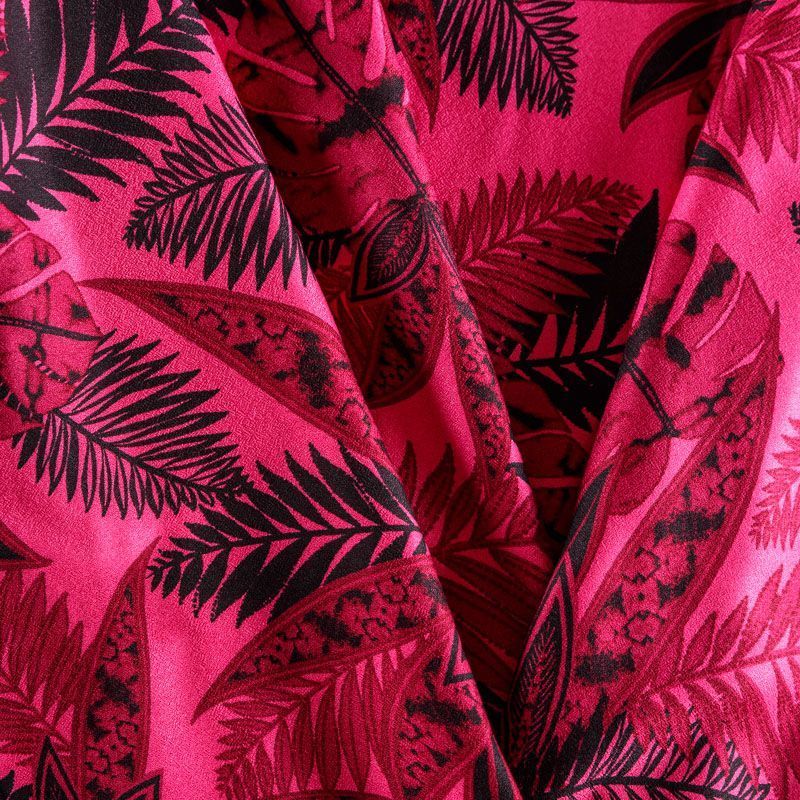 Плательно-блузочный вискозный креп яркого оттенка фуксии с крупным растительным принтом. Ткань средней плотности, имеет зернистую фактуру и матовую поверхность, не просвечивает, пластичная, хорошо драпируется мягкими складками, струится. Подходит для пошива платья и сарафана, юбки, блузки, туники, топа, комбинезона.