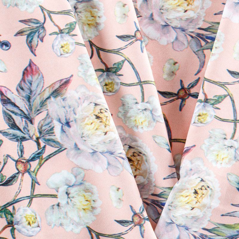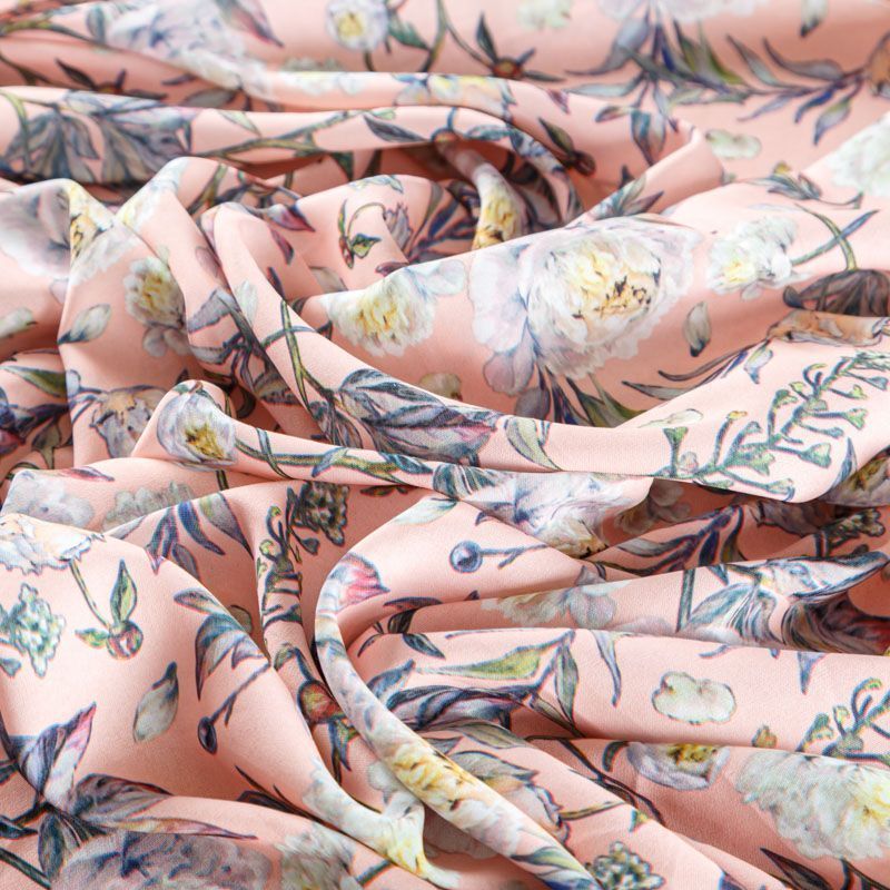 Ткань плательной плотности с флористическим принтом в приглущенных пастельных оттенках. Материал почти мнется и немного прозрачен на свету, имеет креповую фактуру, легкий, хорошо тянется, драпируется струящимися складками, приятный и комфортный в носке. Идеально подходит для пошива платьев, юбок, блуз, комбинезонов.