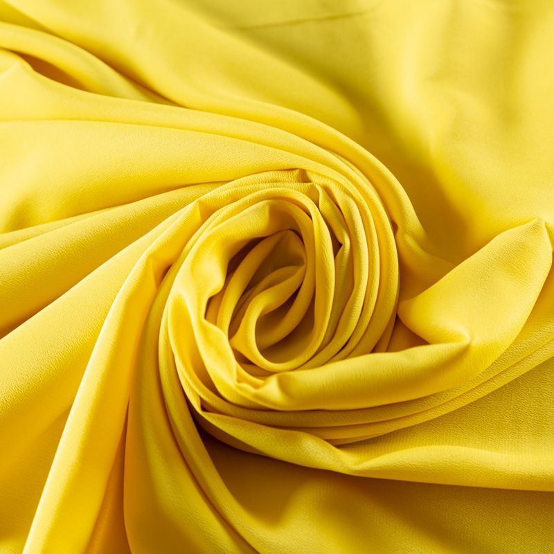 Итальянский натуральный шелковый крепдешин в желтом оттенке, фактурный, легкий и струящийся, слегка просвечивает, отлично драпируется. Идеально подойдет для пошива платьев и сарафанов расклешенных моделей, с воланами, летящих юбок, топов, блузки, юбки, широких брюк, костюма в пижамном стиле.