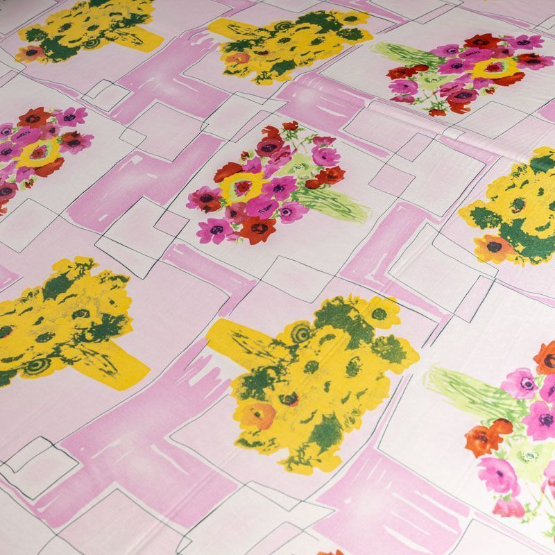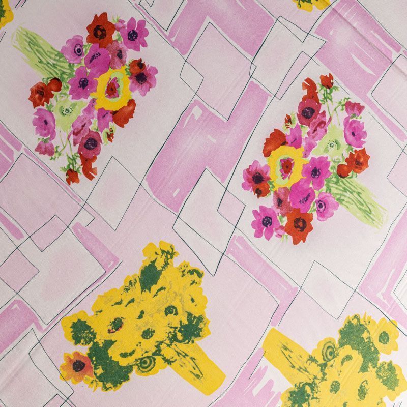 Натуральный шелковый крепдешин с матовой поверхностью, легкий, струящийся, хорошо драпируется. Ткань немного просвечивает, тянется за счет эластана в составе. Универсальный цветочный принт с сочетании в геометрическим рисунком будет уместен для пошива летнего сарафана, платья, блузки, костюма в пижамном стиле, широких брюк или юбки.