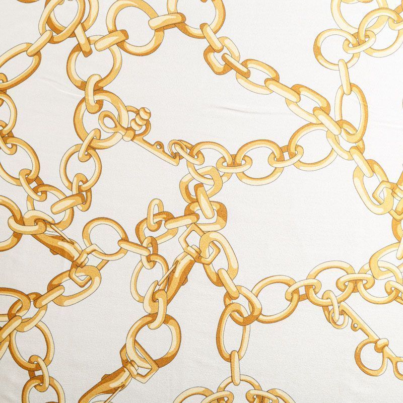Итальянский натуральный крепдешин в молочном оттенке с золотыми цепочками, тонкий, слегка прозрачный, отлично драпируется, легкий и струящийся. Идеально подойдет для пошива платьев и сарафанов расклешенных моделей, с воланами, летящих юбок, топов, блузки, юбки, широких брюк, костюма в пижамном стиле.