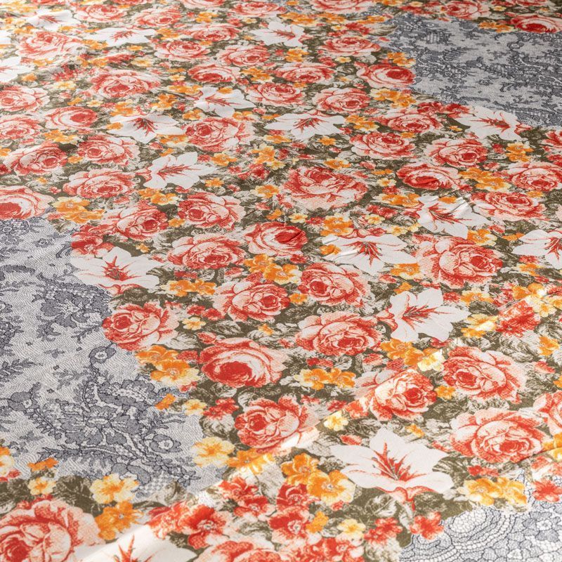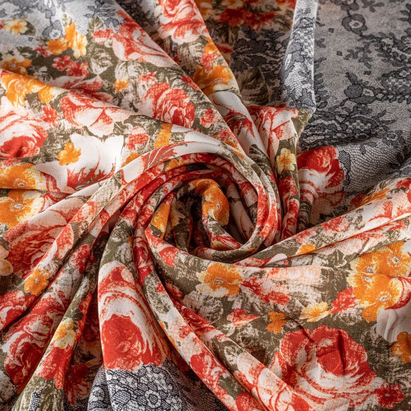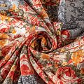Натуральный шелковый крепдешин с матовой поверхностью, легкий, струящийся, хорошо драпируется. Изысканное сочетание яркого цветочного принта в красно-желтых оттенках с имитацией черного тонкого кружева подойдет для пошива летнего сарафана, платья, блузки, костюма в пижамном стиле, широких брюк или юбки.
