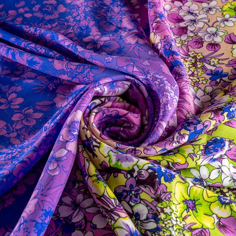 Натуральный шелковый крепдешин с эффектом деграде с плавным переходом от сиреневого до яркого-синего цвета, дополненный цветочным принтом, подойдет для ценителей ярких образов. Ткань имеет матовую поверхность, легкая, тонкая, струящаяся, хорошо драпируется, тянется за счет эластана в составе. Будет идеальна для пошива летнего сарафана, платья, блузки, костюма в пижамном стиле, широких брюк или юбки.