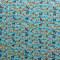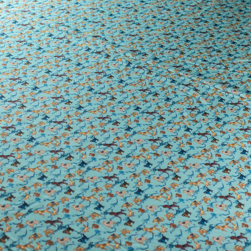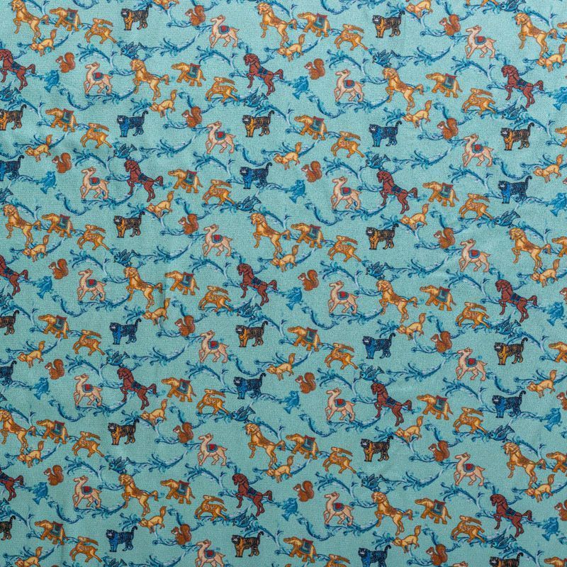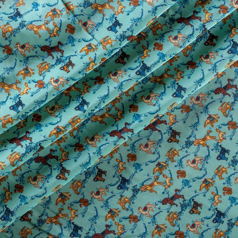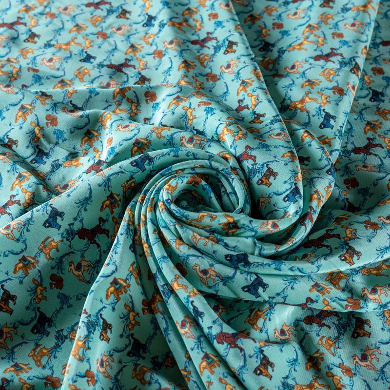 Натуральный шелковый крепдешин с матовой поверхностью, легкий, струящийся, хорошо драпируется. Стилизованный анималистический принт выполнен бежево-коричневой гамме на фоне бирюзового оттенка. Крепдешин прекрасно подойдет для пошива летнего сарафана, платья, блузки, костюма в пижамном стиле, широких брюк или юбки.