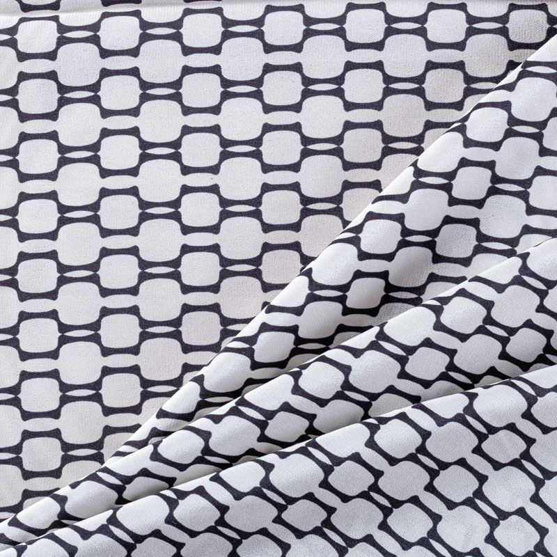 Итальянский натуральный крепдешин с абстрактным черным принтом тонкий, немного прозрачный, отлично драпируется, легкий и струящийся. Идеально подойдет для пошива платьев и сарафанов расклешенных моделей, с воланами, летящих юбок, топов, блузки, юбки, широких брюк, костюма в пижамном стиле.