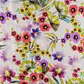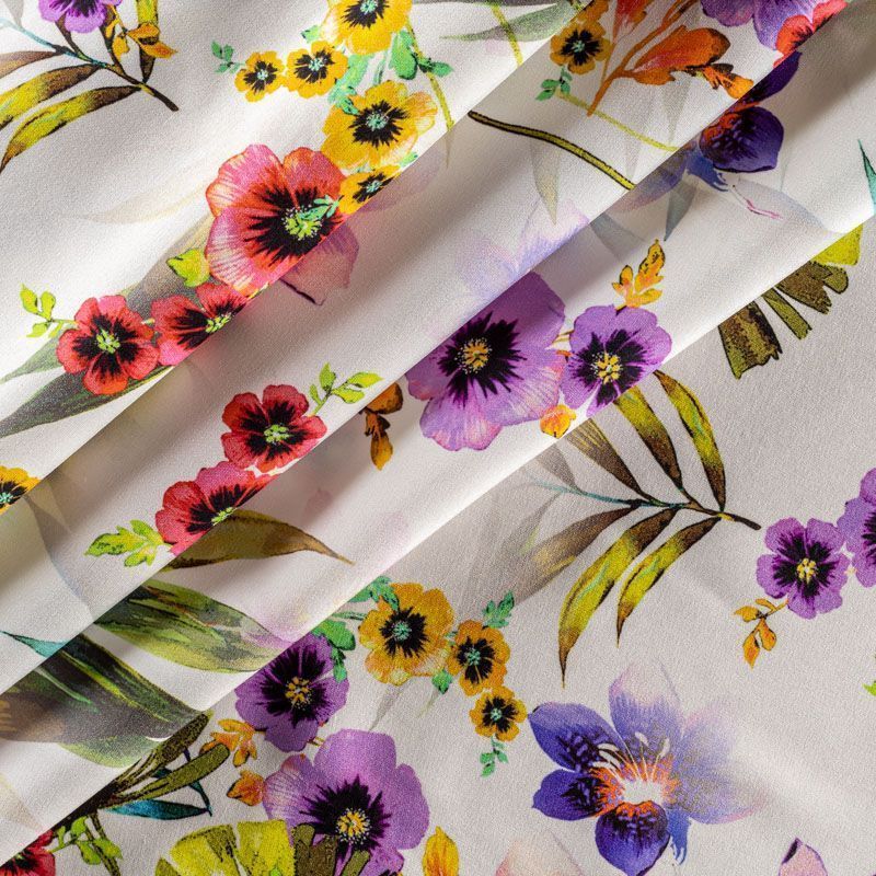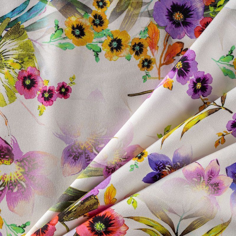 Натуральный шелковый крепдешин с матовой поверхностью, легкий, струящийся, хорошо драпируется, тянется за счет эластана в составе. Цветочный принт выполнен в ярких актуальных оттенках, который будет уместен для пошива летнего сарафана, платья, блузки, костюма в пижамном стиле, широких брюк или юбки.