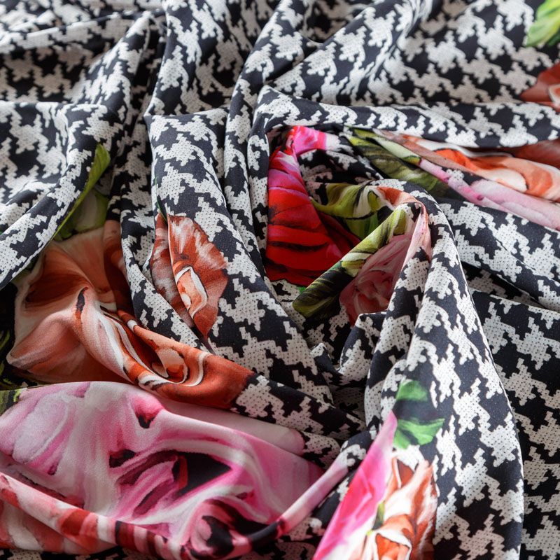 Итальянский крепдешин с матовой лицевой поверхностью с принтом гусиная лапка и цветами, тонкий, слегка прозрачный, отлично драпируется, тянется за счет эластана в составе, легкий и струящийся. Идеально подойдет для пошива платьев и сарафанов расклешенных моделей, с воланами, летящих юбок, топов, блузки, костюма в пижамном стиле.