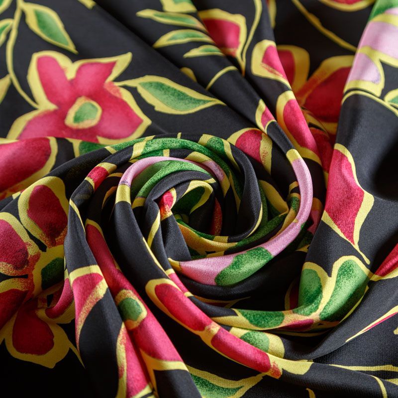 Итальянский крепдешин с матовой лицевой поверхностью со стилизованным акварельным цветочным принтом, тонкий, слегка прозрачный, отлично драпируется, легкий и струящийся. Идеально подойдет для пошива платьев и сарафанов расклешенных моделей, с воланами, летящих юбок, топов, блузки, костюма в пижамном стиле.