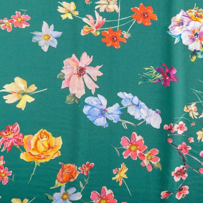 Итальянский крепдешин с матовой лицевой поверхностью с цветочным принтом на зеленом фоне, тонкий, слегка прозрачный, отлично драпируется, легкий и струящийся. Идеально подойдет для пошива платьев и сарафанов расклешенных моделей, с воланами, летящих юбок, топов, блузки, костюма в пижамном стиле.