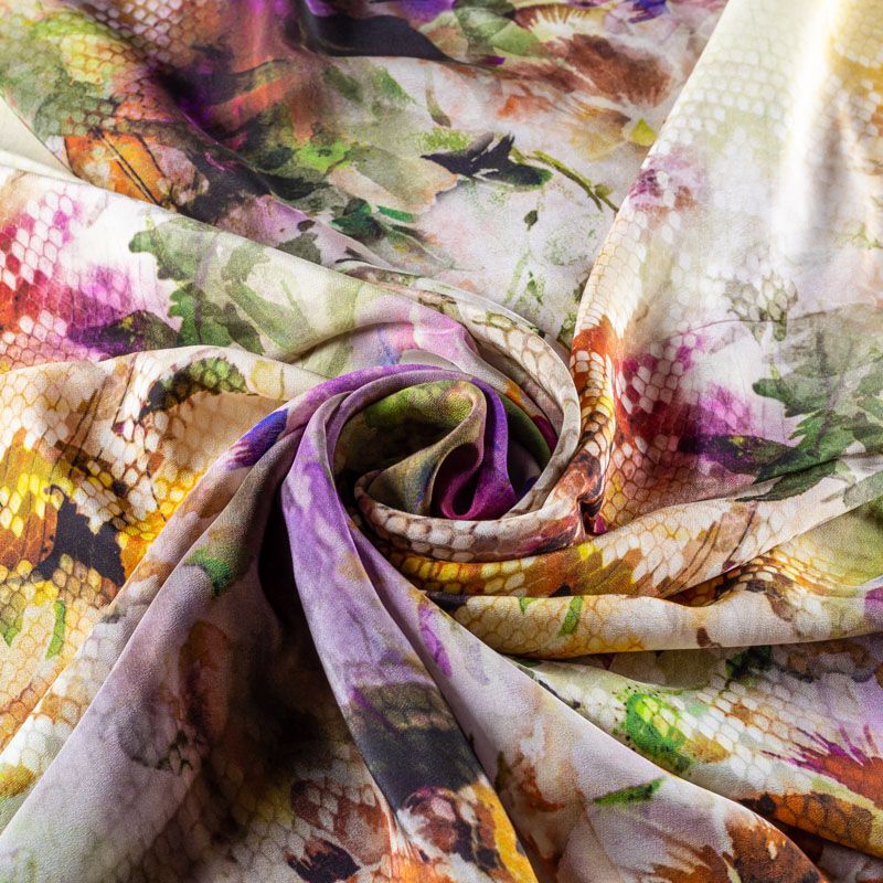 Натуральный шелковый крепдешин с матовой поверхностью, легкий, струящийся, хорошо драпируется, провсечивает. Цветочный принт выполнен в акварельной технике с элементами анималистической темы. Крепдешин прекрасно подойдет для пошива летнего сарафана, платья, блузки, костюма в пижамном стиле, широких брюк или юбки.