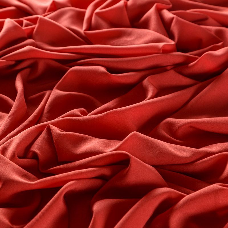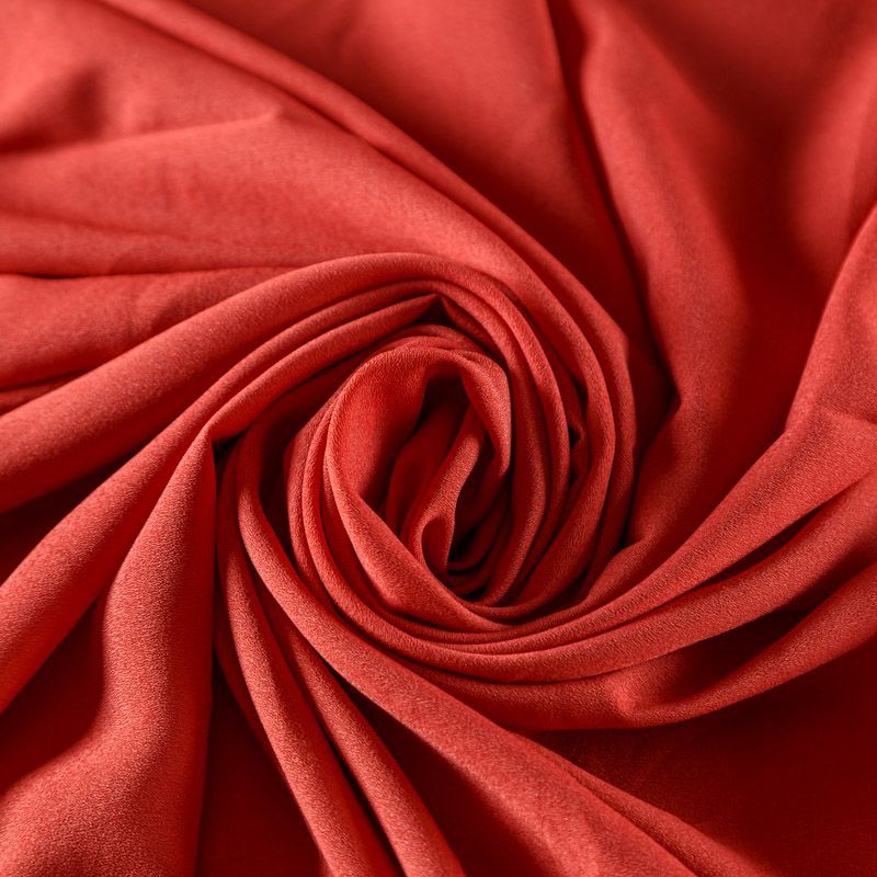 Крепдешин красного оттенка, тонкий, легкий, фактурный, приятный на ощупь. Очень пластичный, тянется за счет эластана в составе, прекрасно драпируется и струится. Ткань слегка просвечивает, можно использовать подклад. Идеально будет смотреться в платье, юбке, тунике, рубашке или блузке.