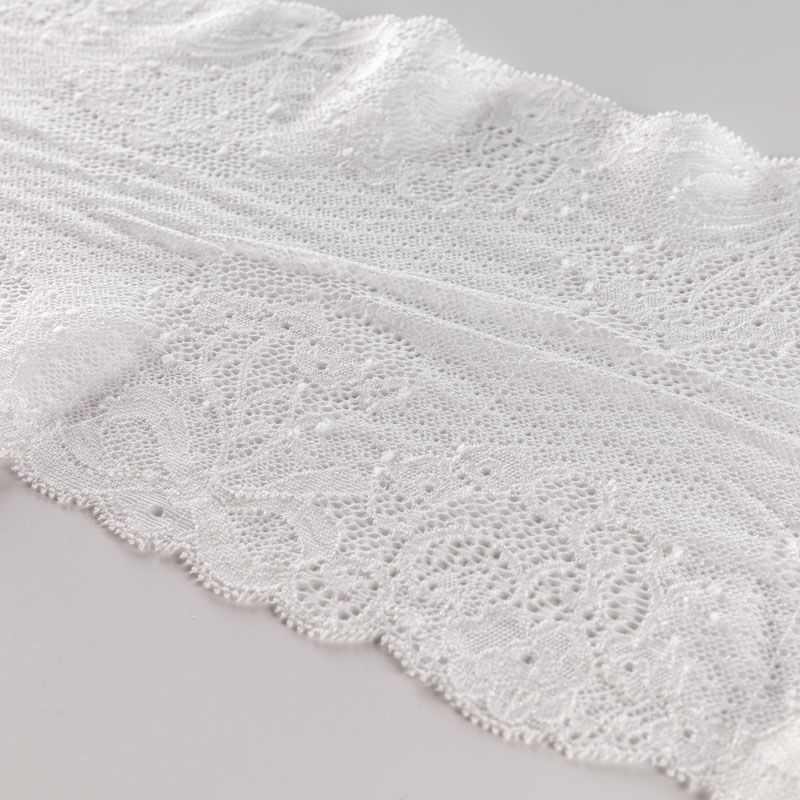 Эластичное кружево сочетает в себе мягкость, прочность и красоту, благодаря своей упругости оно долго не теряет первоначальную форму. Используется для пошива нижнего белья, а так же применяется как отделочный декор в одежде.
