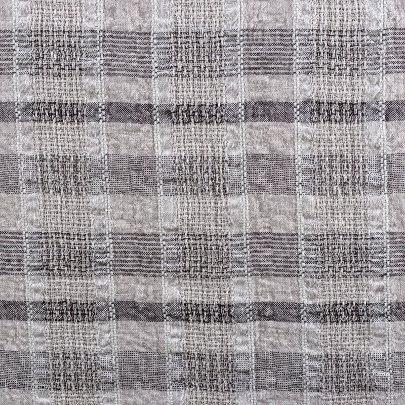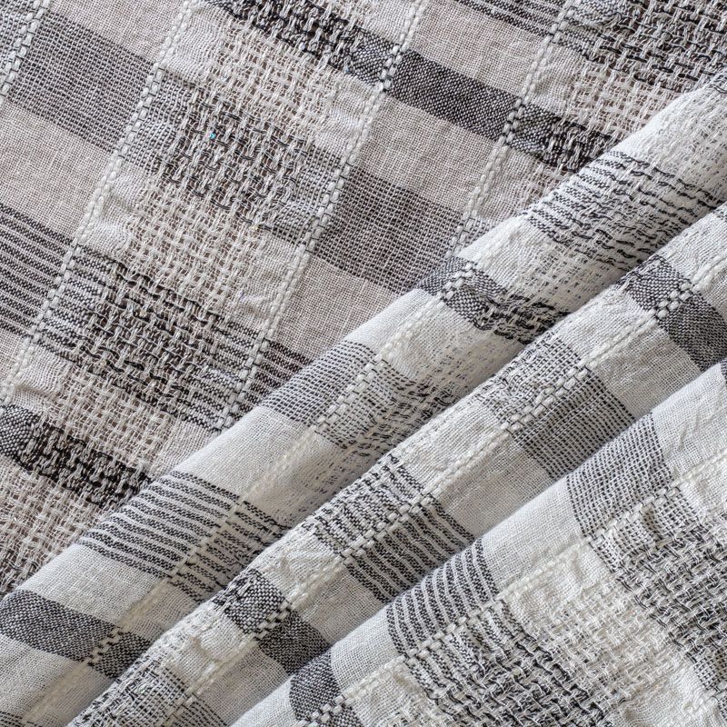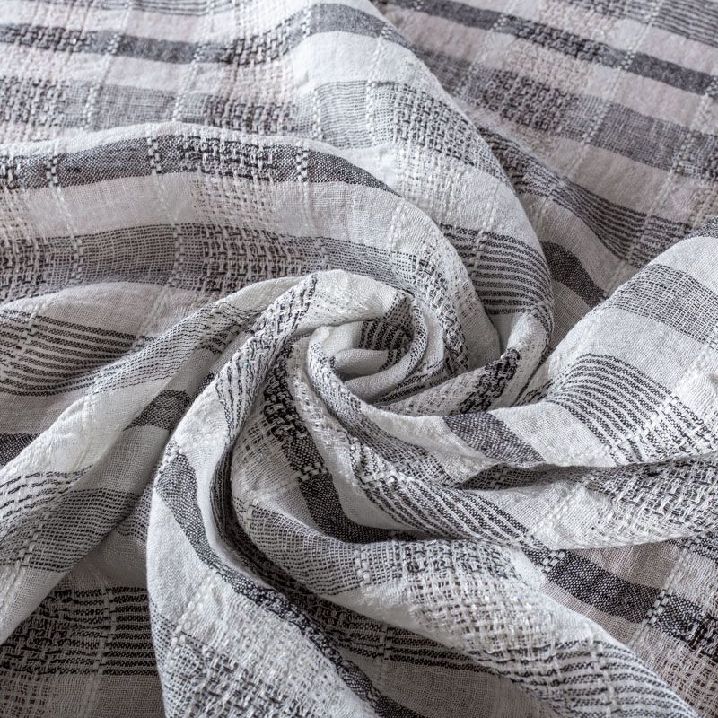 Итальянский лен с добавлением вискозы средней плотности со сложной "клетчатой" геометрией в черно-белых оттенках декорирован мелкими пайетками. Различная толщина нитей создает эффектную фактуру. Ткань пластичная, гибкая за счет плетения, матовая, мягкая, приятная на ощупь, не рыхлая, комфортная в изделии. Отлично подойдет для пошива летних костюмов, рубашек, туник, платьев, сарафанов, юбок, жакетов, брюк или шорт, легкого пальто.