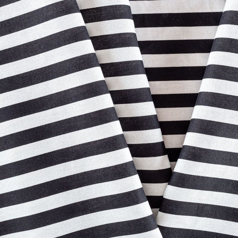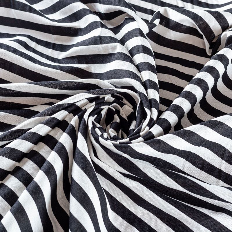 Льняная костюмно-плательная ткань в вертикальную полоску черного цвета средней ширины. Ткань прочная и плотная, с выразительной матовой рельефной поверхностью и полотняным переплетением, отлично держит форму, комфортная в изделии. Стильный вариант для летних пальто, кардиганов, платьев, сарафанов, юбок, жакетов, брюк или шорт.