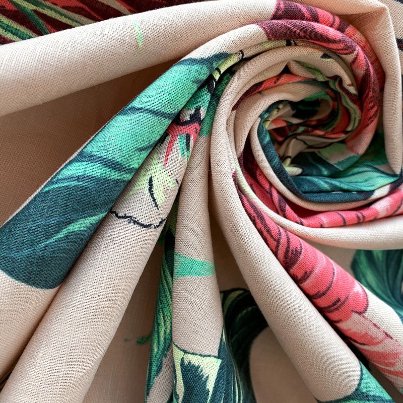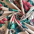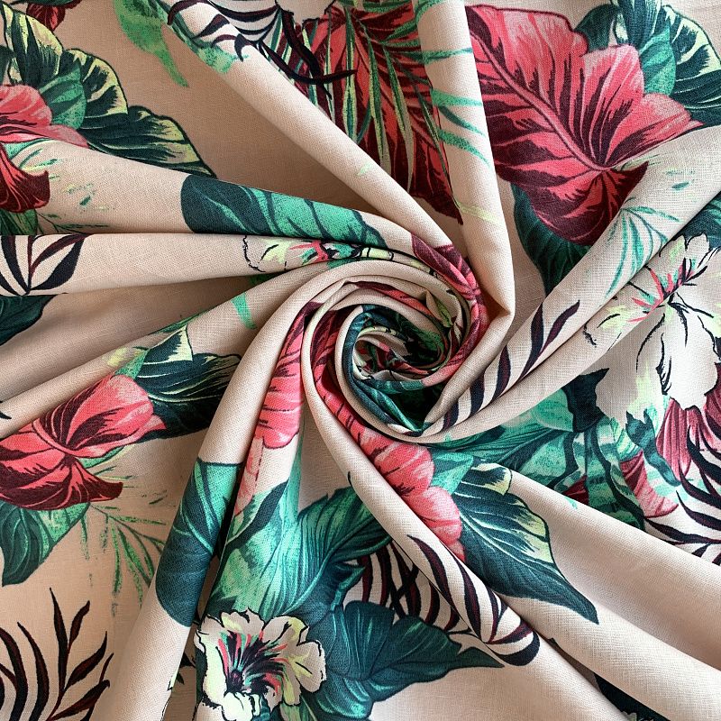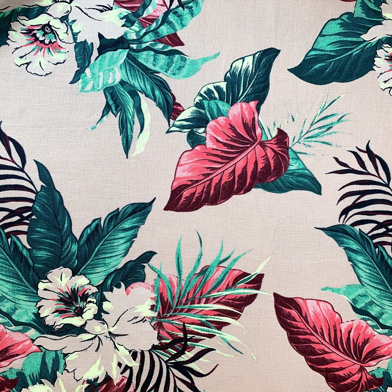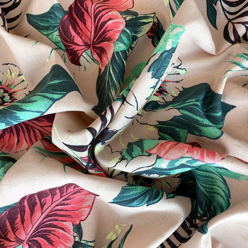 Прочный, выразительная матовая рельефная поверхность, полотняное переплетение, хорошо держит форму, мягкий на ощупь, пластичный, отлично драпируется, тянется. Прекрасно подойдет для пошива летних платьев, сарафанов, юбок, рубашек, брюк и шорт. Льняная плательная ткань с изображением ярких тропических цветов и растений на благородном бежевом фоне.