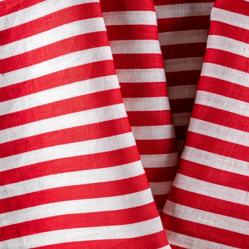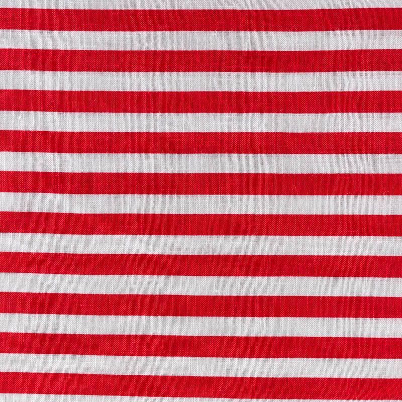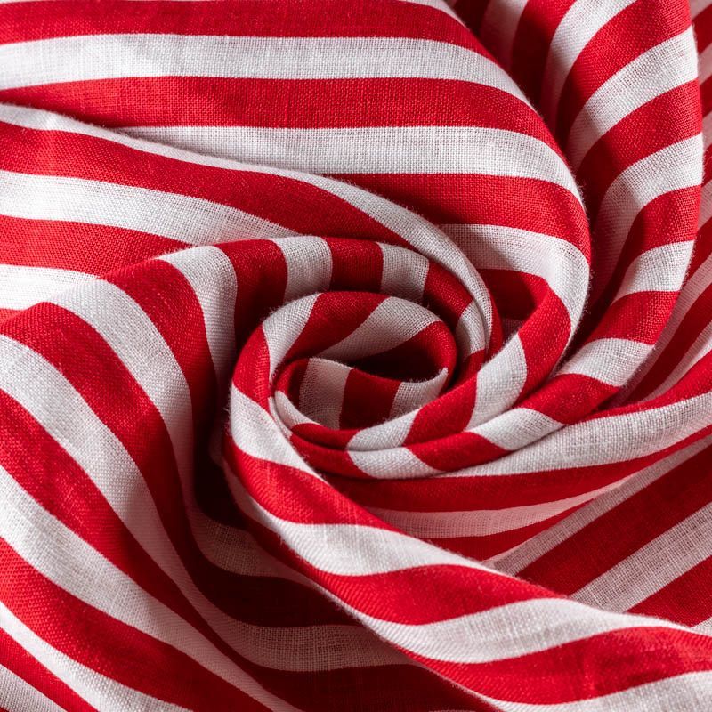Плательно-рубашечный лен в красно-молочную полоску. Ткань легкая, средней плотности, поверхность матовая. Приятная на ощупь, хорошо держит форму. Отличный вариант для летних  платьев, сарафанов, рубашек, брюк или шорт.