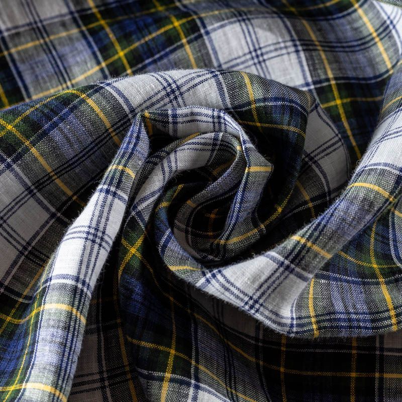 Прочный, выразительная матовая рельефная поверхность, полотняное переплетение, хорошо держит форму, жестковатый на ощупь, но комфортный в изделии. Прекрасно подойдет для пошива летних платьев, сарафанов, туники, юбки, рубашки, брюк и шорт. Льняная плательная ткань молочного цвета со сложной красивой многоцветной клеткой.