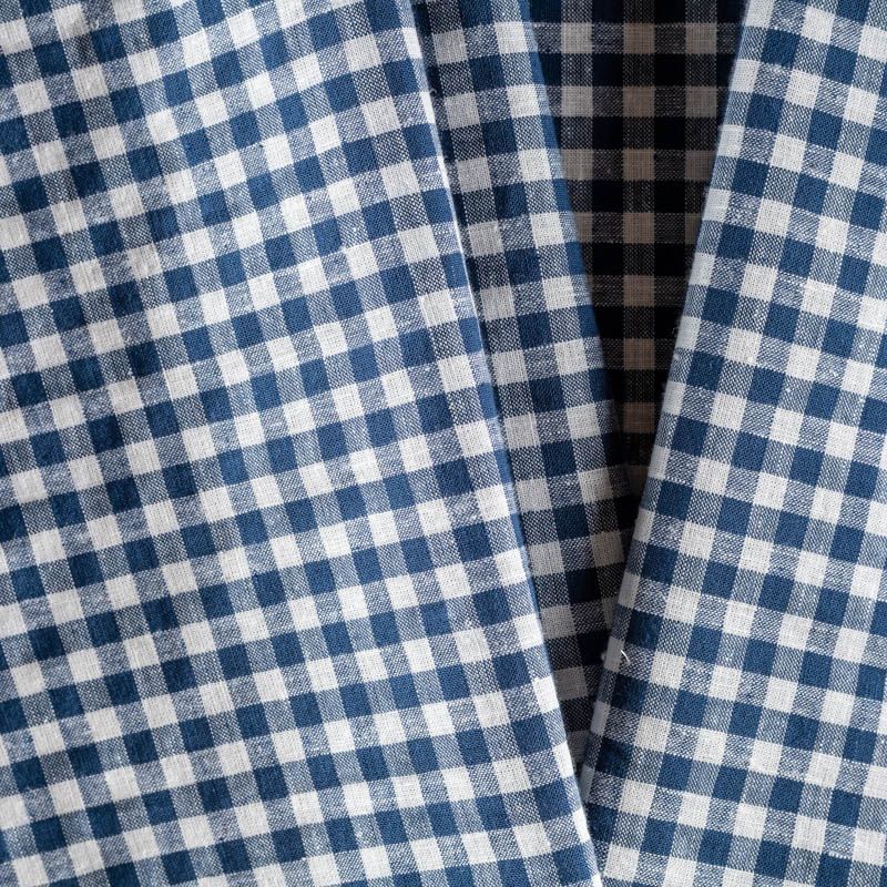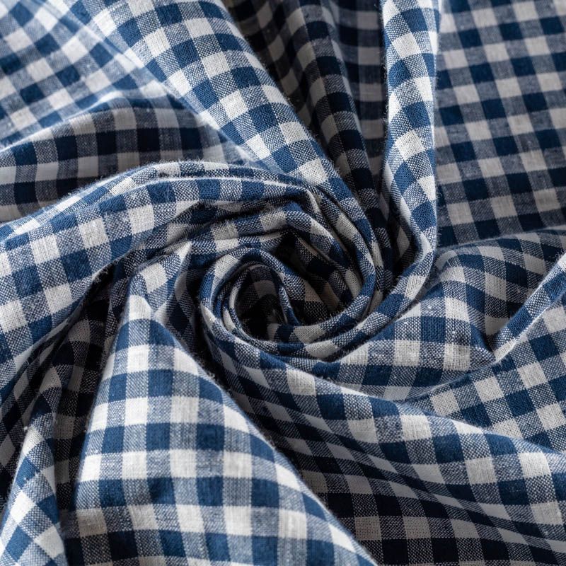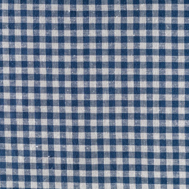 Плательно-рубашечный лен в темно-синюю клеточку. Ткань легкая, средней плотности, поверхность матовая. Приятная на ощупь, хорошо держит форму. Отличный вариант для летних  платьев, сарафанов, рубашек, шорт.