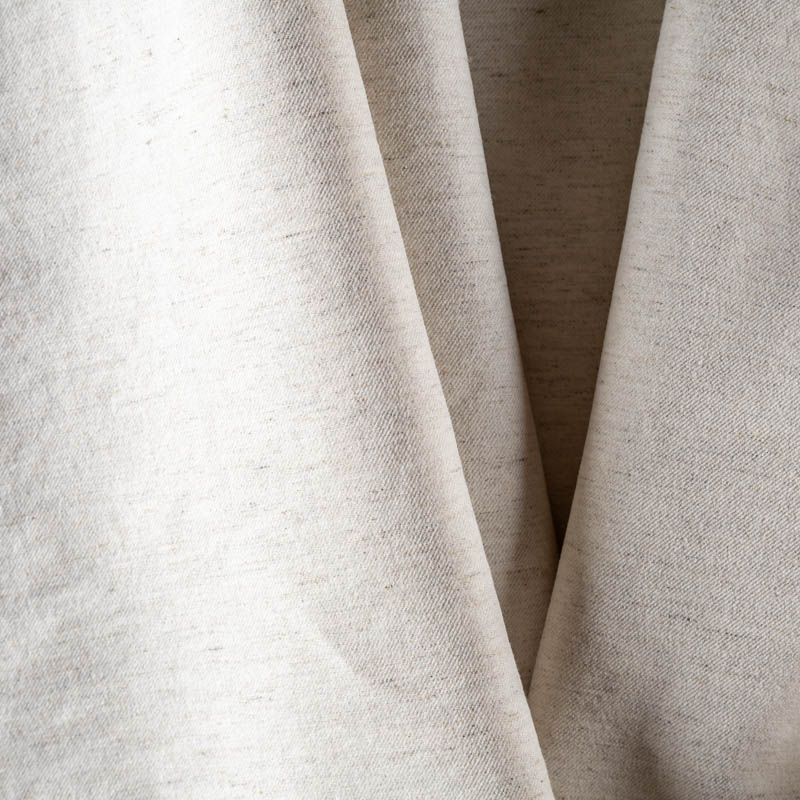 Костюмно-плательный полулен молочного оттенка с серыми вкраплениями. Ткань плотная, но мягкая и пластичная, поверхность матовая, твиловая. Приятная на ощупь, держит форму, отлично тянется. Прекрасный вариант для платьев облегающеего силуэта, сарафанов, костюмов, юбок, брюк или шорт.