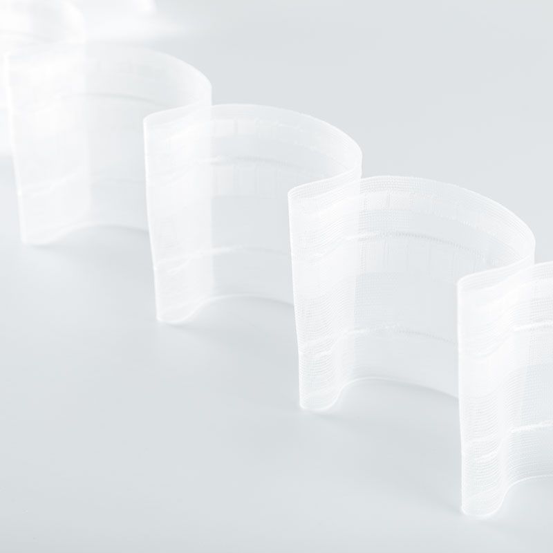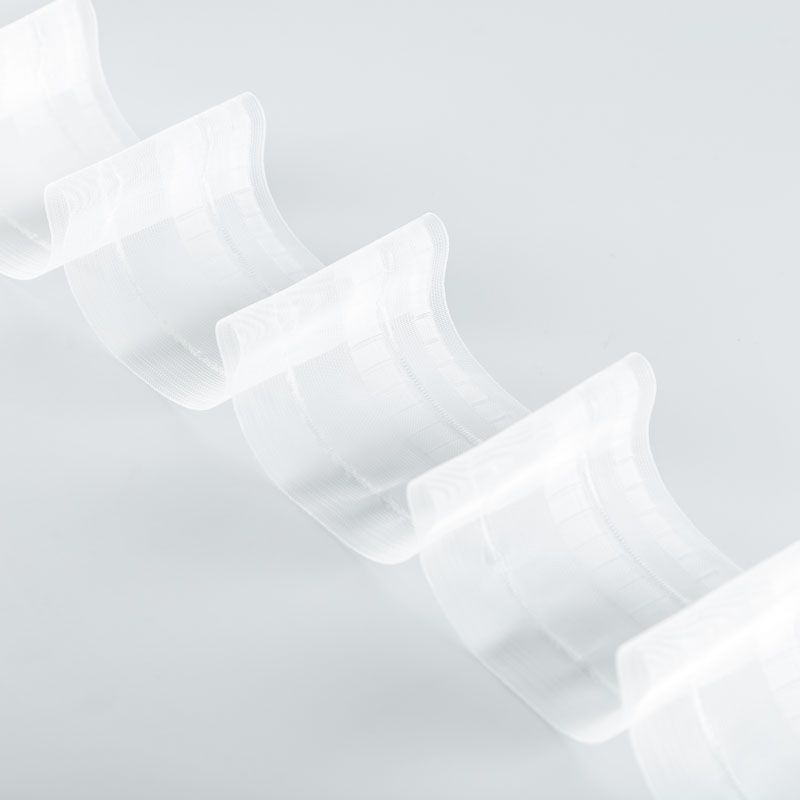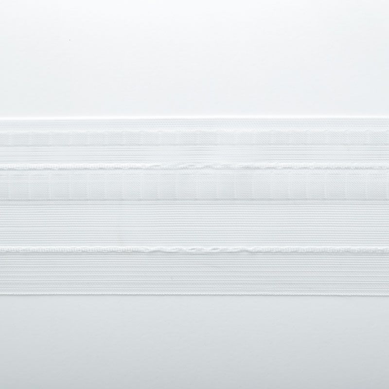 Шторная лента полностью прозрачная для тюлей и портьерных тканей с глубокой одинарной складкой. Сокращение - 1:1,5, раппорт - 18 см, расстояние между складками - 12 см, 2 ряда кармашков, крепление - крючки.
