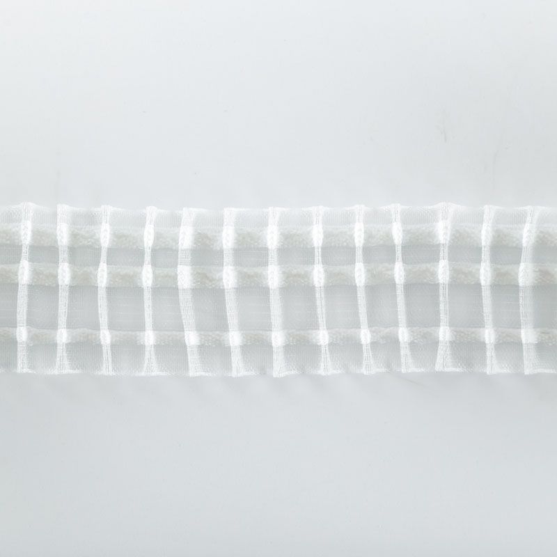 Шторная лента прозрачная для тюлей и портьерных тканей с карандашной сборкой. Сокращение - 1:2,5, раппорт - 25 см, 2 ряда непрозрачных белых кармашков, крепление - крючки.