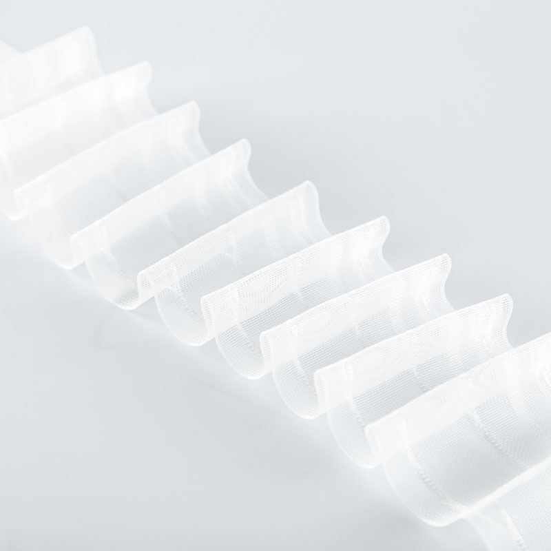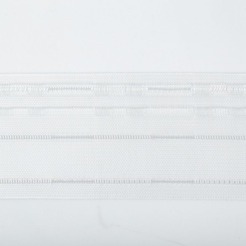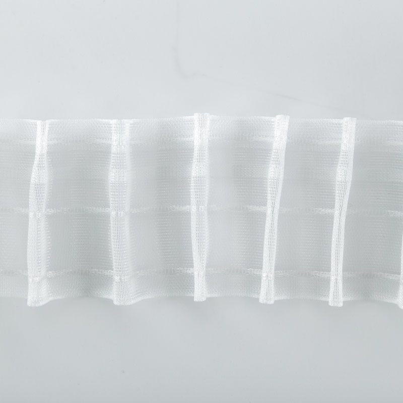 Шторная лента полностью прозрачная для тюлей и портьерных тканей c карандашной складкой. Сокращение - 1:2, раппорт - 6 см, 2 ряда кармашков, крепление - крючки.